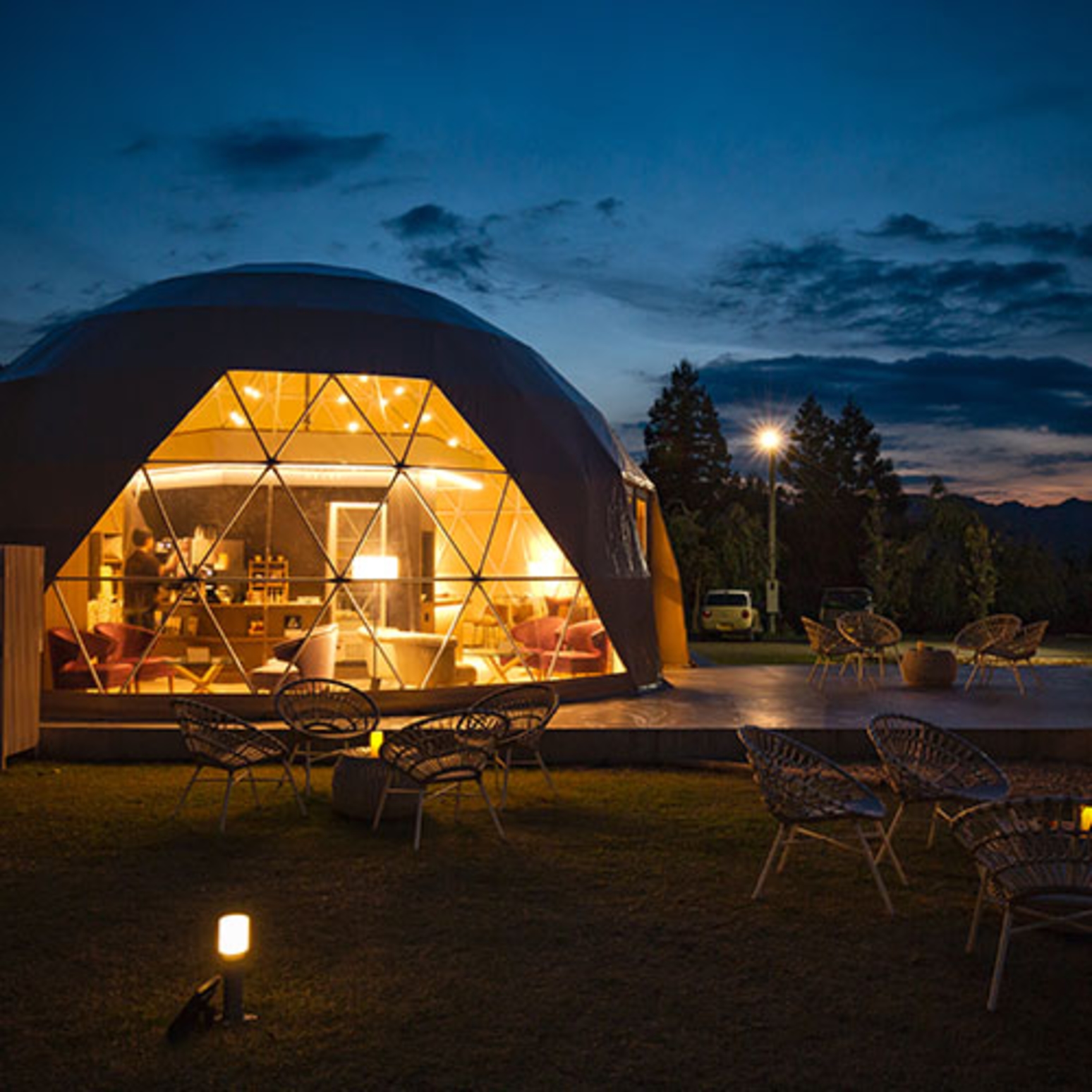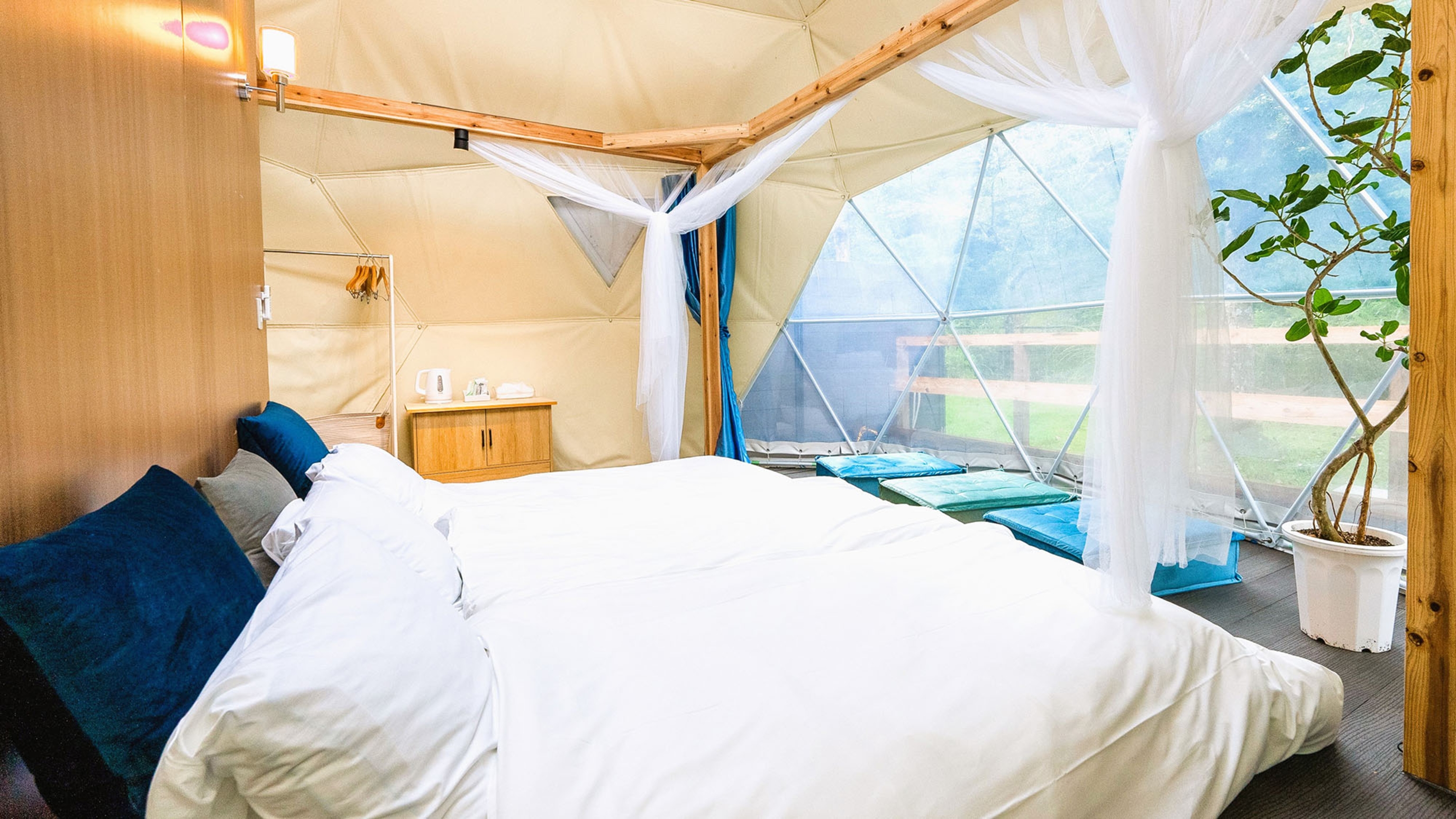 ドームテントは2重構造になっており断熱性に優れ、全てのお部屋に半露天風呂、トイレ、エアコン完備で一年中快適にお過ごしいただけます。