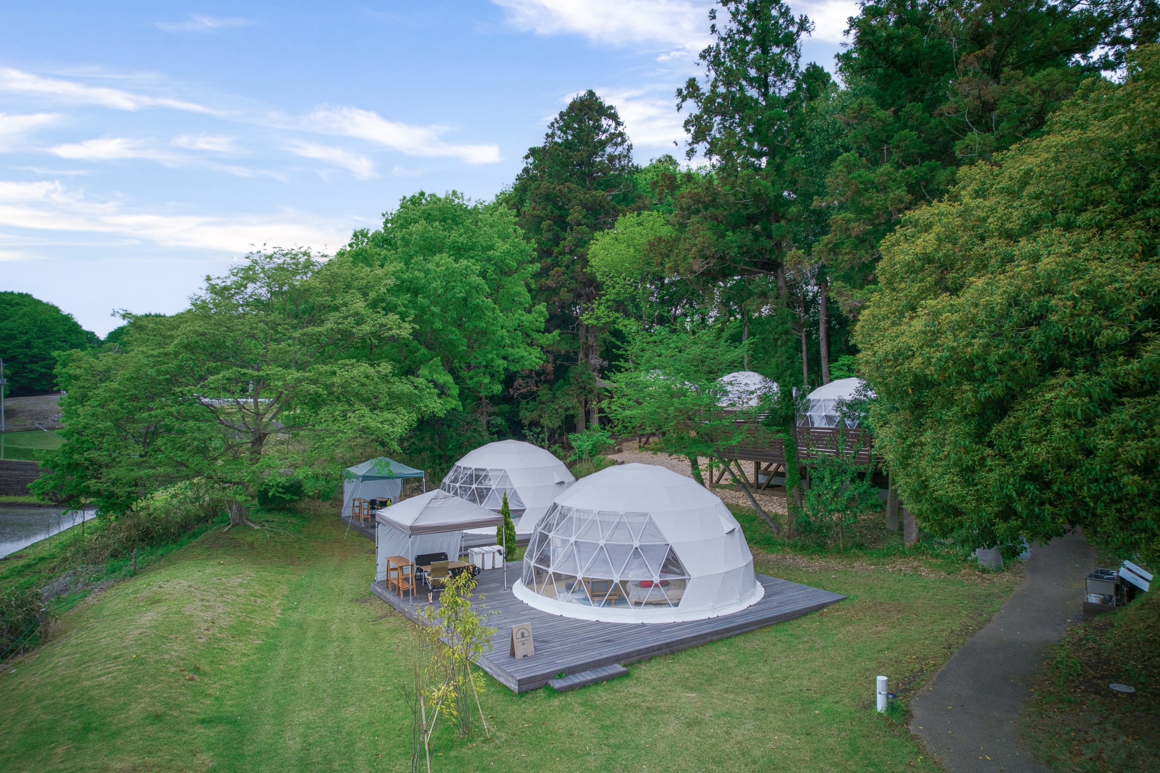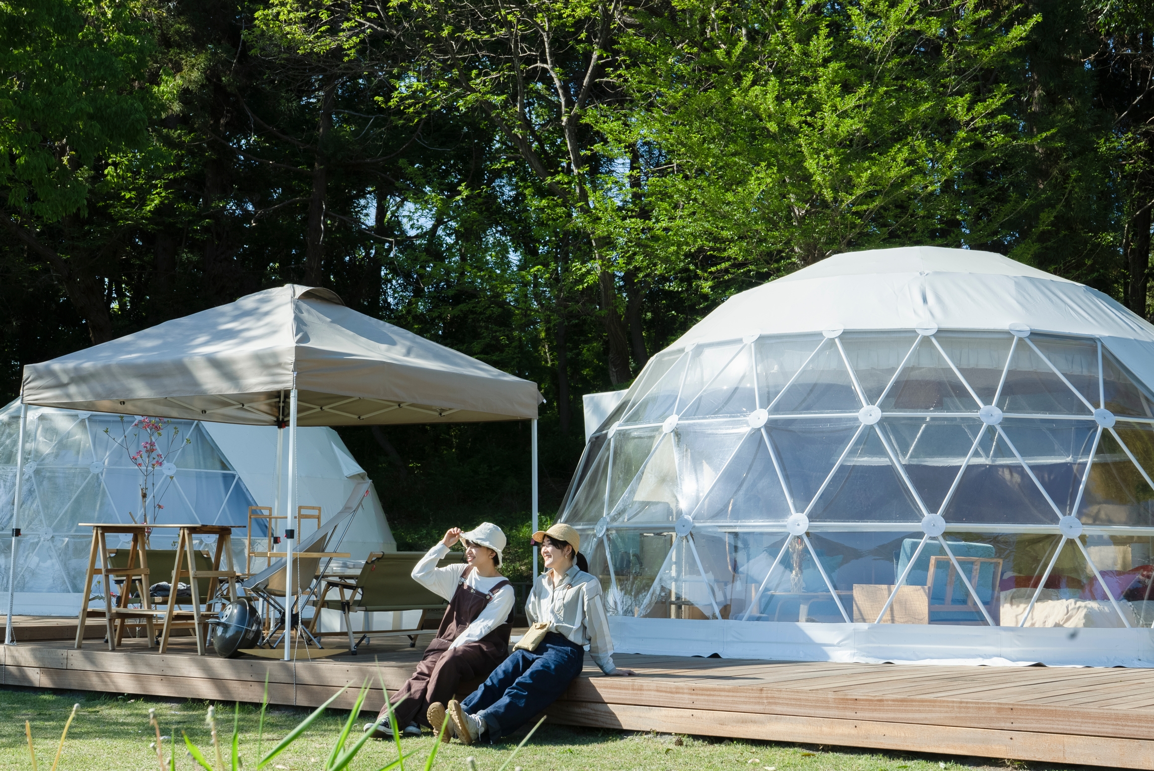 非日常的空間で贅沢を味わえる楕円型のドームテント、トレーラーキャビンにてグランピング体験をすることができる「井頭温泉チャットパレス」