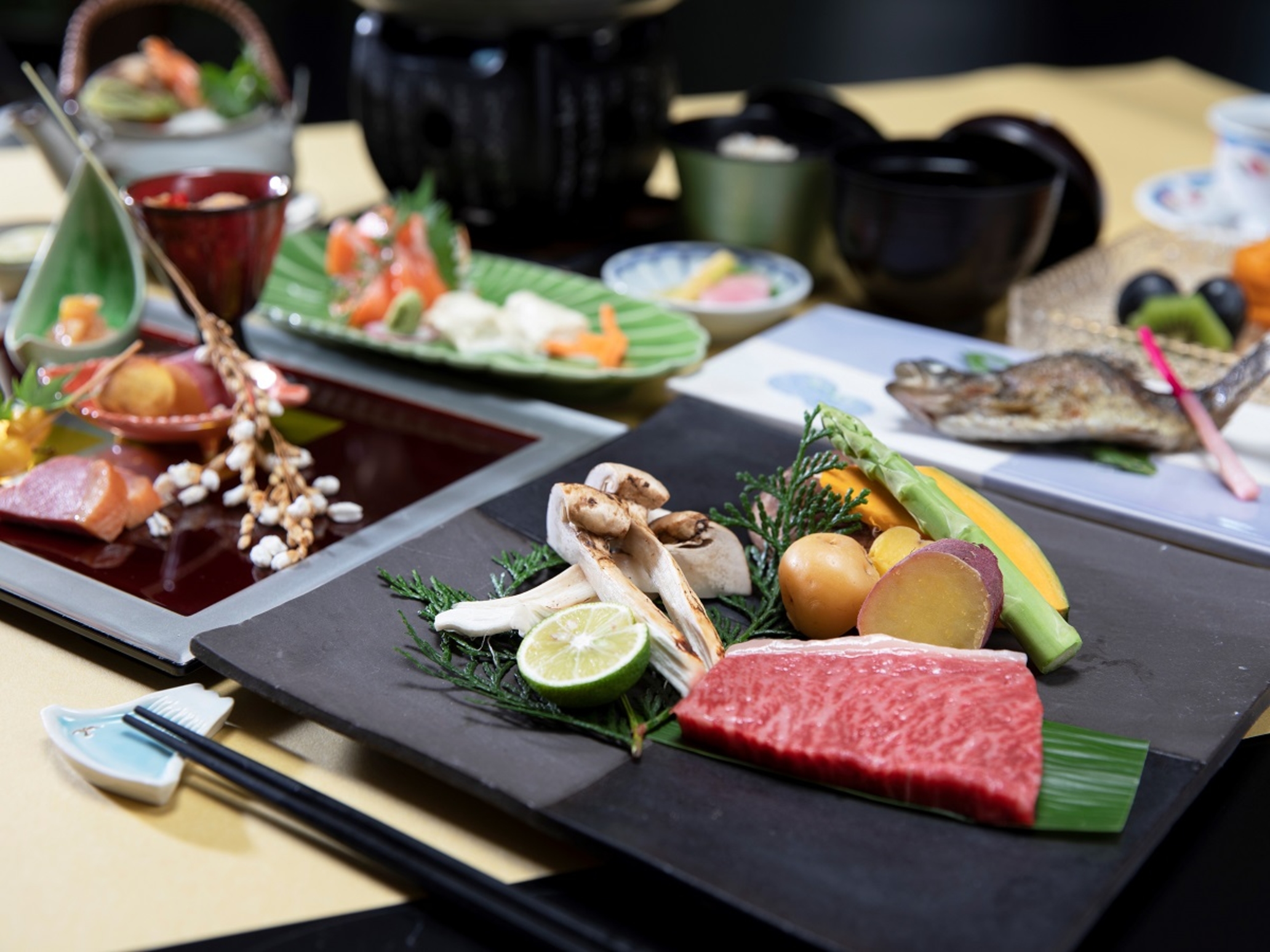 夕食は、栃木和牛、名水育ちの虹鱒姿焼き、食前酒に地酒など、一乃館オリジナルの季節のコース料理となります!