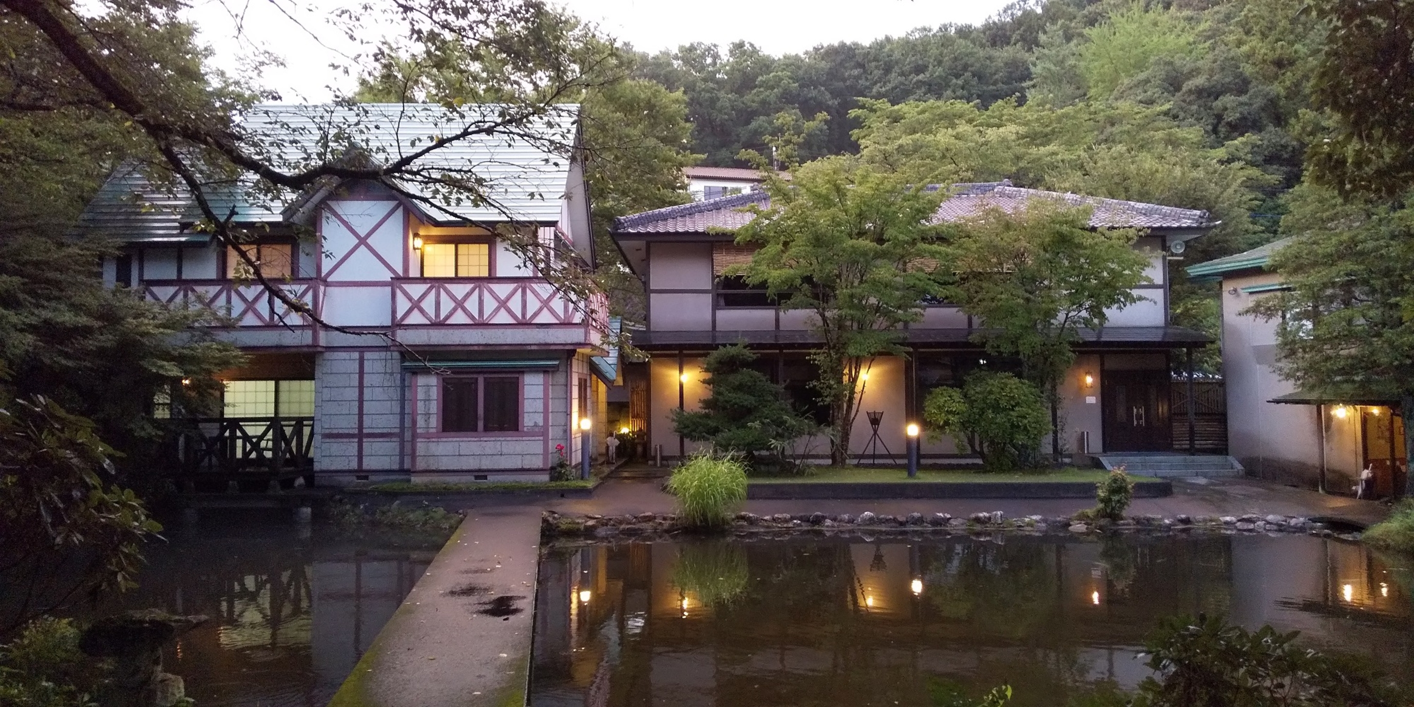 広大な日本庭園に、大正ロマン風の館内、本館と離れや特別棟が点在します。