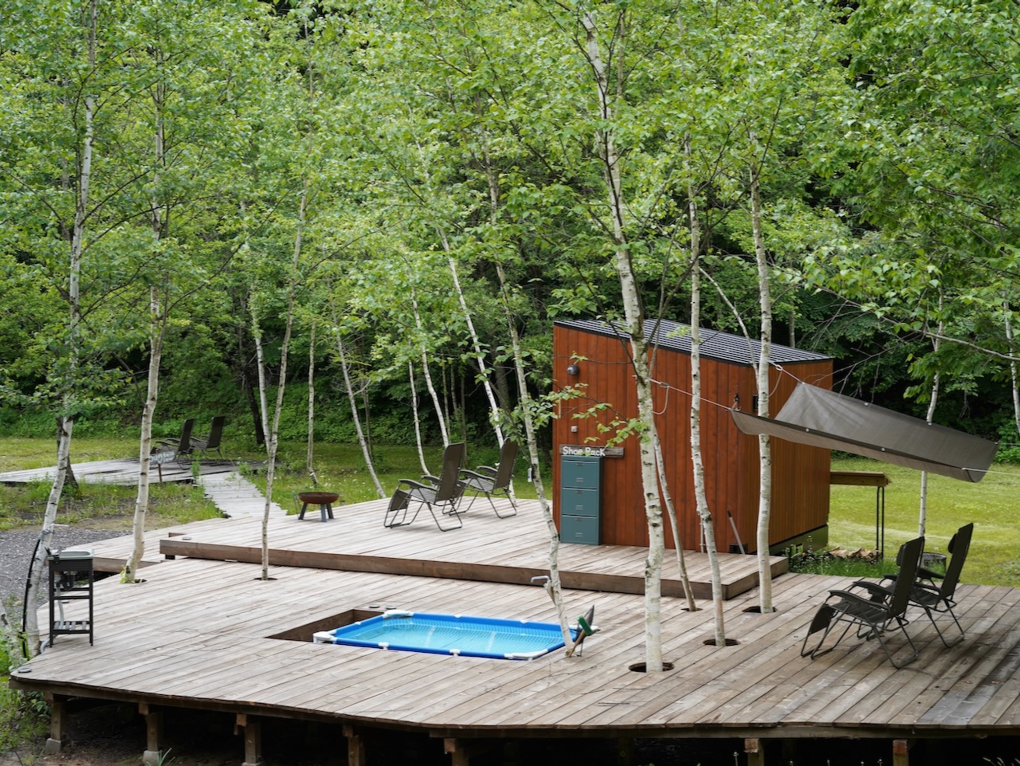 「スタイルキャビン」は冬期にski in ski outができ、夏は焚き火を楽しめる秘密基地的コンテナハウス。