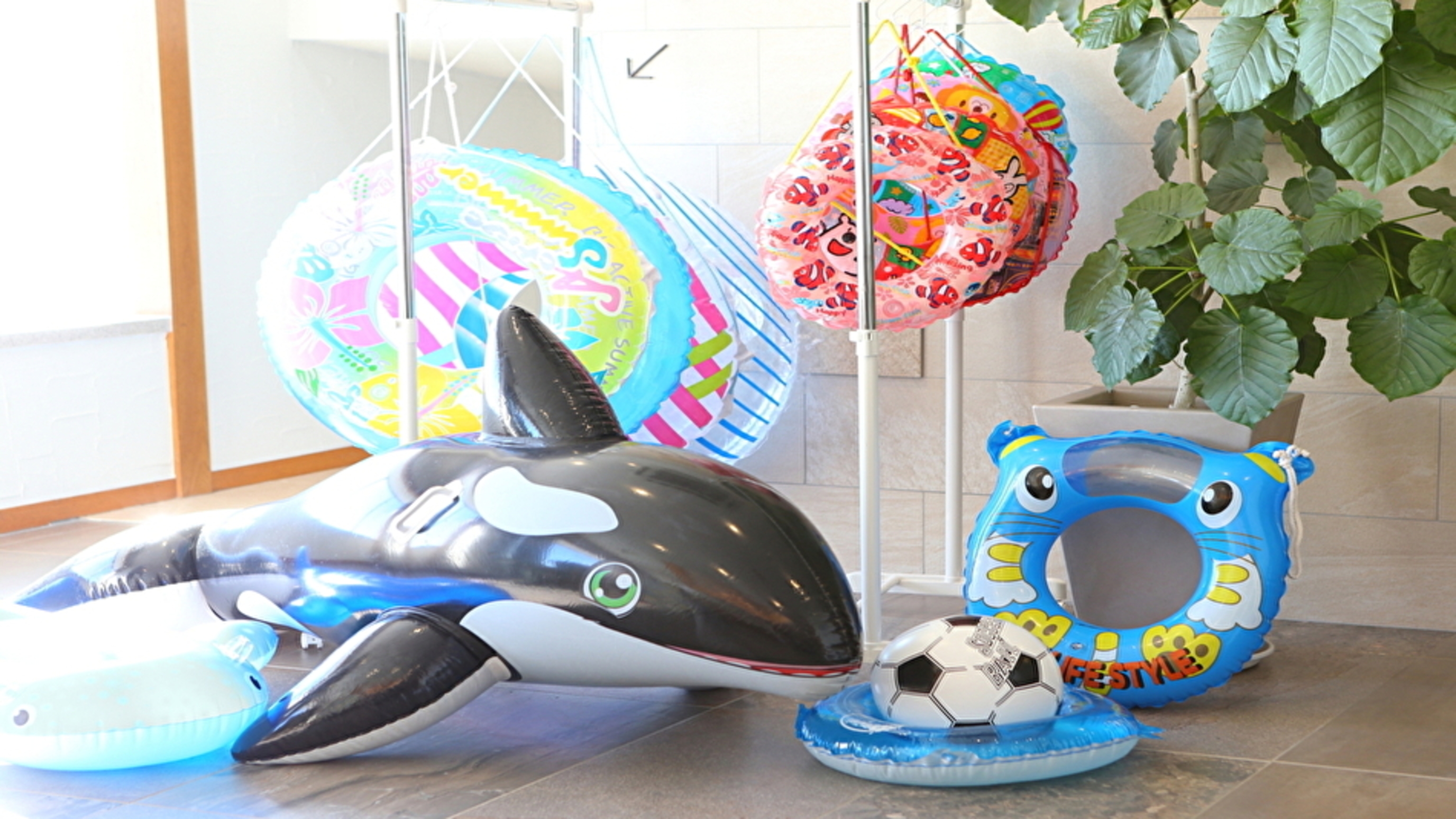 「コテージ森林村」の敷地内には自然の川が流れていて、浮き輪やゴムボートでの水遊びを楽しむことができます。