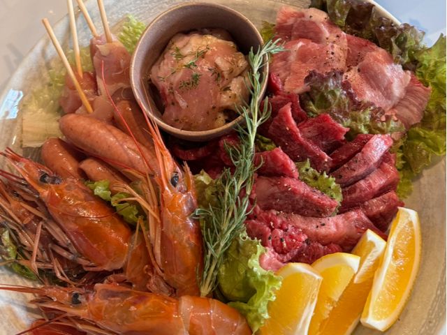 開放的な空間でその場で焼き上げて食べるこだわりのお肉、野菜、海鮮は格別です!