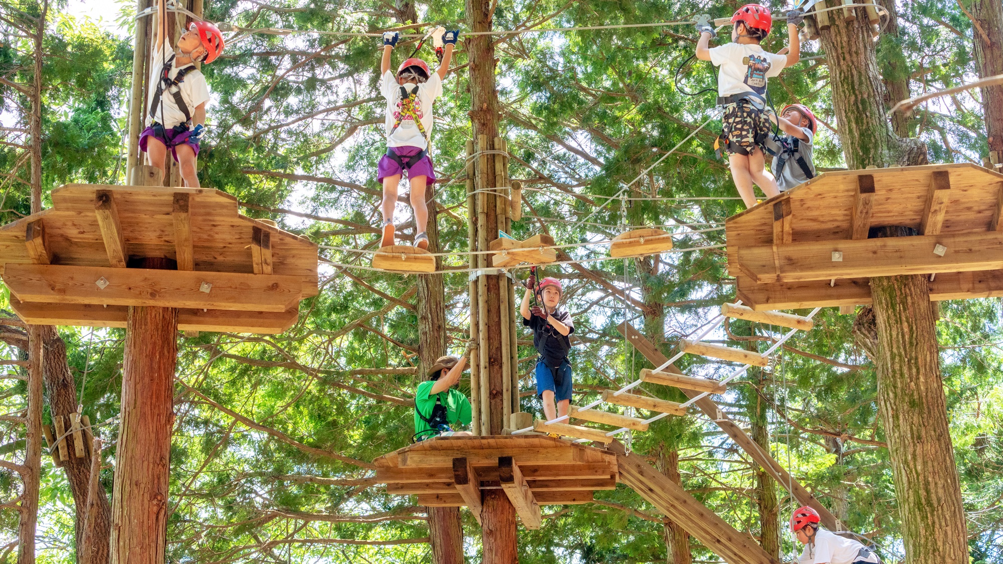 子どもから大人まで体力、身長や年齢に応じて誰もがチャレンジできるコースを用意しており、年齢の上限はなく、どなたでも大自然の中のアスレチックをお楽しみいただけます!