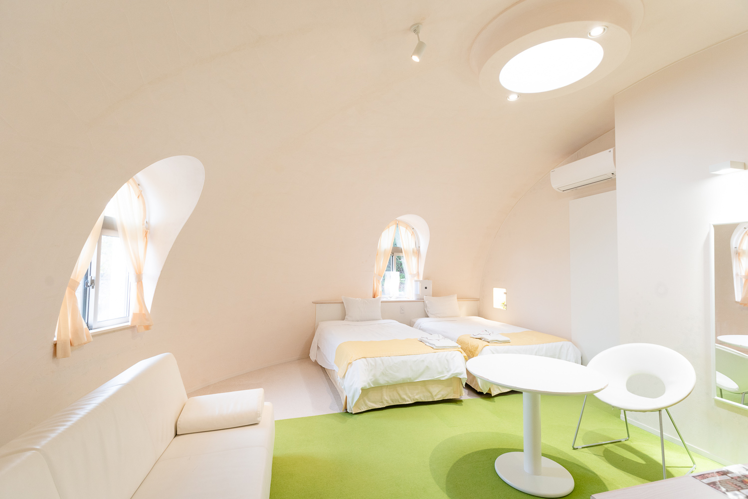 広々としたベッドが配置された屋内の宿泊部屋と木の香りが豊かなコテージタイプのグランピング施設の2タイプを併設。