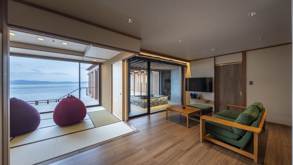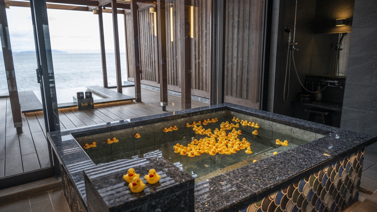 お風呂は男女2つの大浴場の他、4つの貸切展望露天風呂あり、その中でもMATSUはペントハウススイート専用。