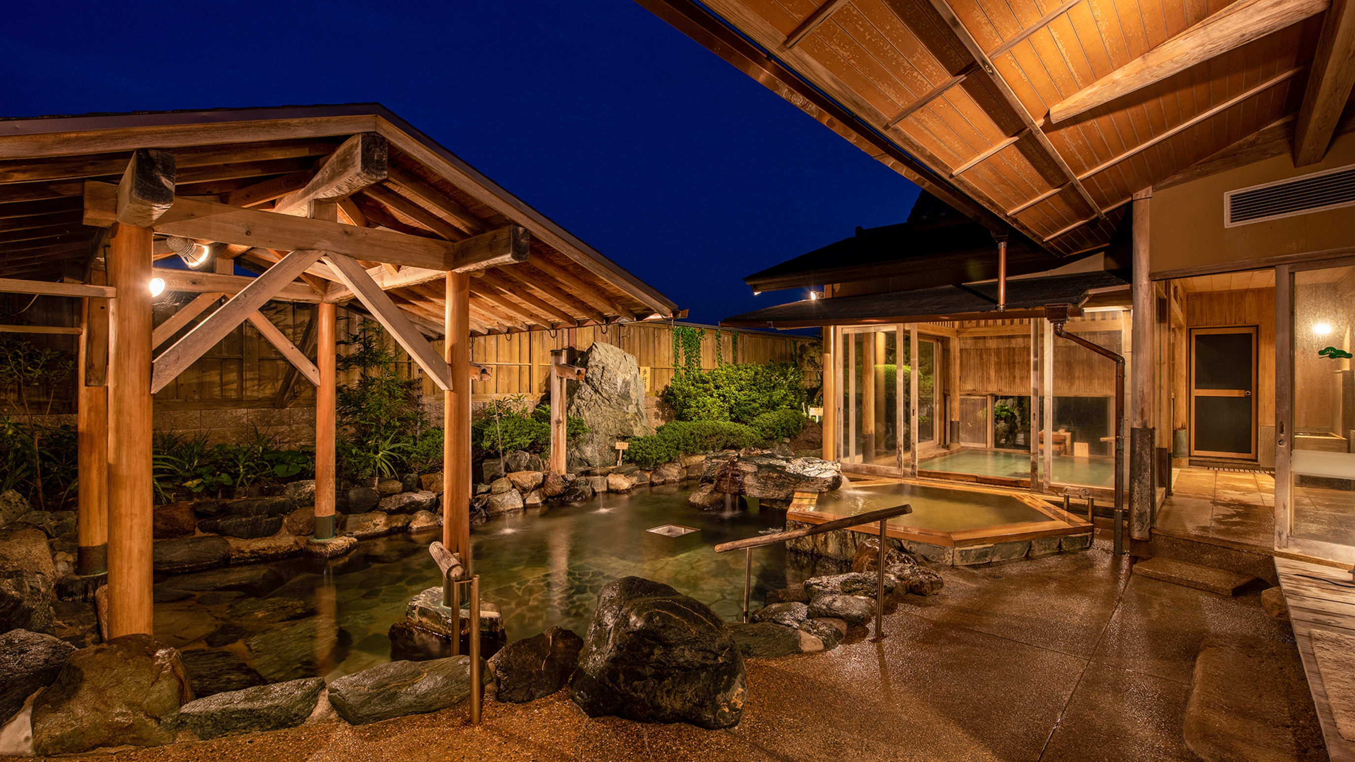 四季に合わせて様々な表情を見せる露天風呂には、内湯をはじめ、檜風呂、岩風呂、打たせ湯、歩行湯、寝湯と、趣の異なるお風呂をご用意。