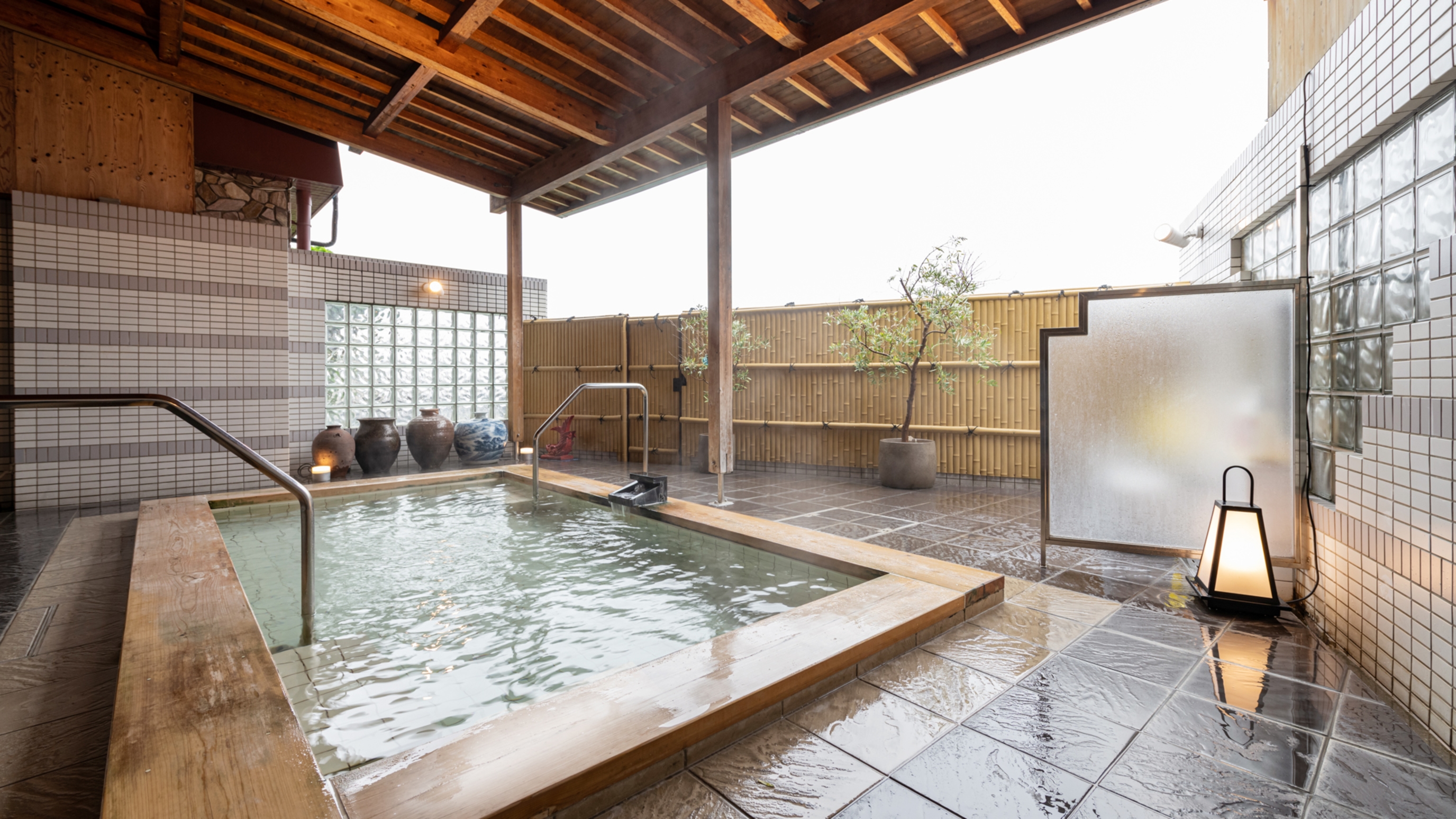 バラエティ豊かな、庭園露天風呂「風待ちの湯」での湯汲も格別。