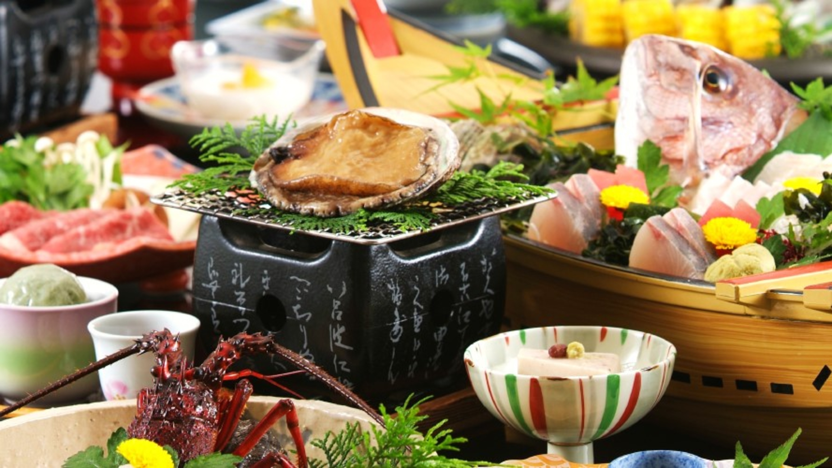 福寿荘では季節によってお楽しみいただける、伊勢海老、的矢牡蠣、安乗ふぐ、黒アワビ、宝彩海老、松坂牛など、「伊勢ブランド」が勢揃い。