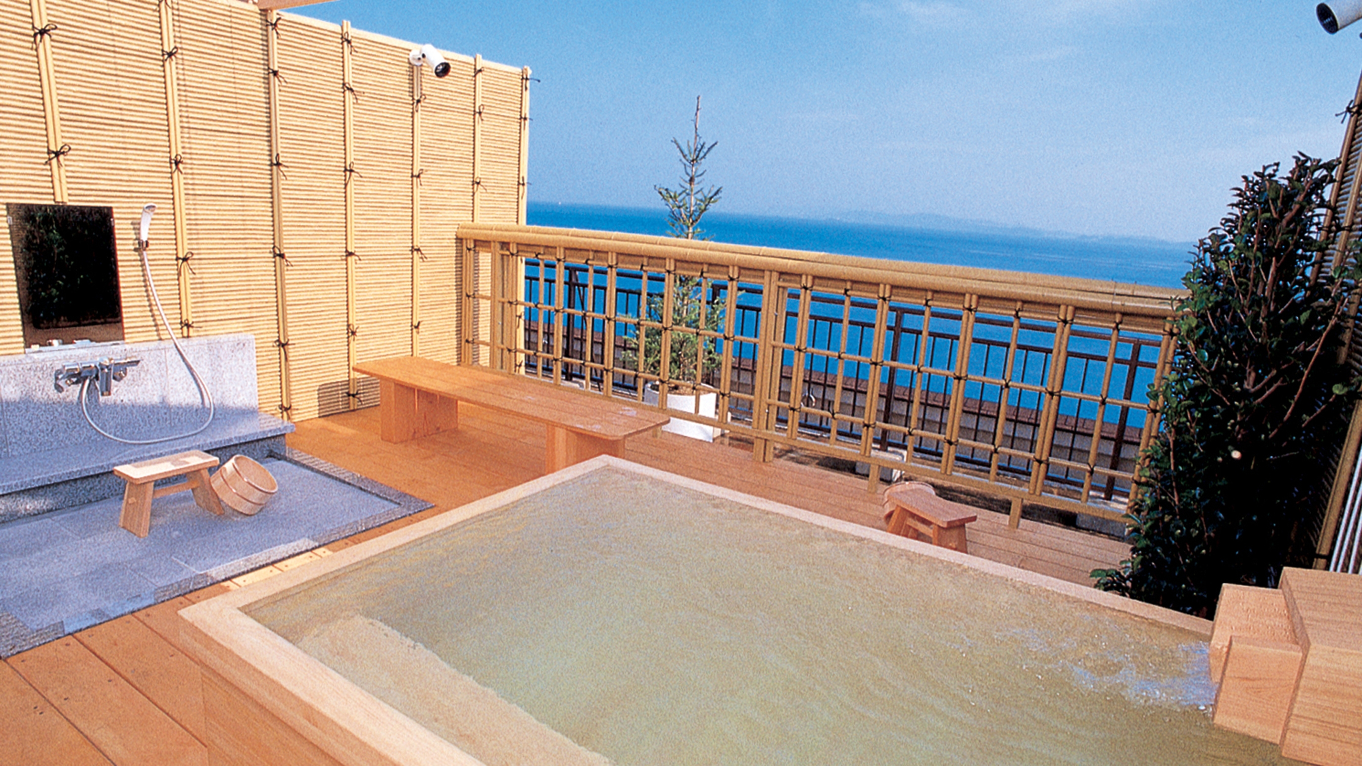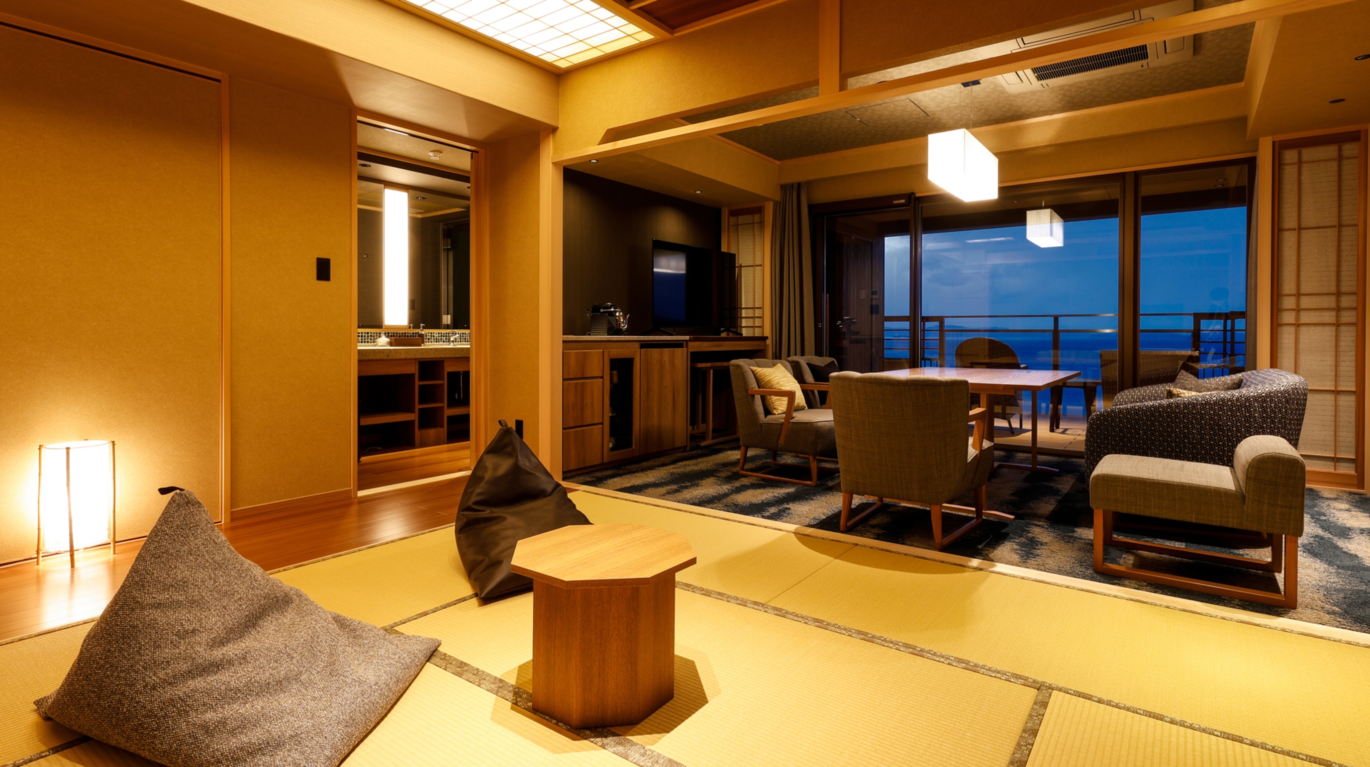 ファミリーラグジュアリー「波のまにまに」は、お部屋から一望できる最上級のロケーションに、海までわずか3mの露天風呂はインフィニティを楽しむことができる専用設計。