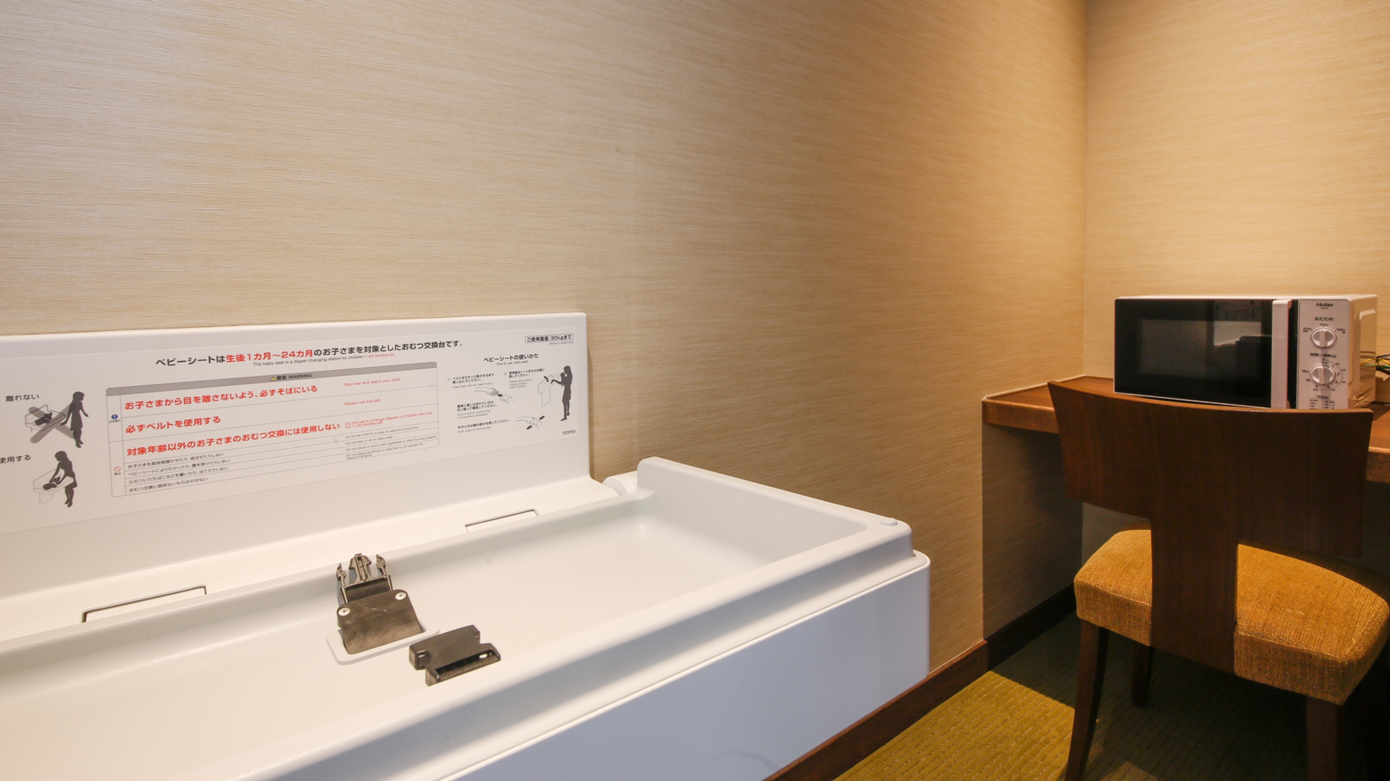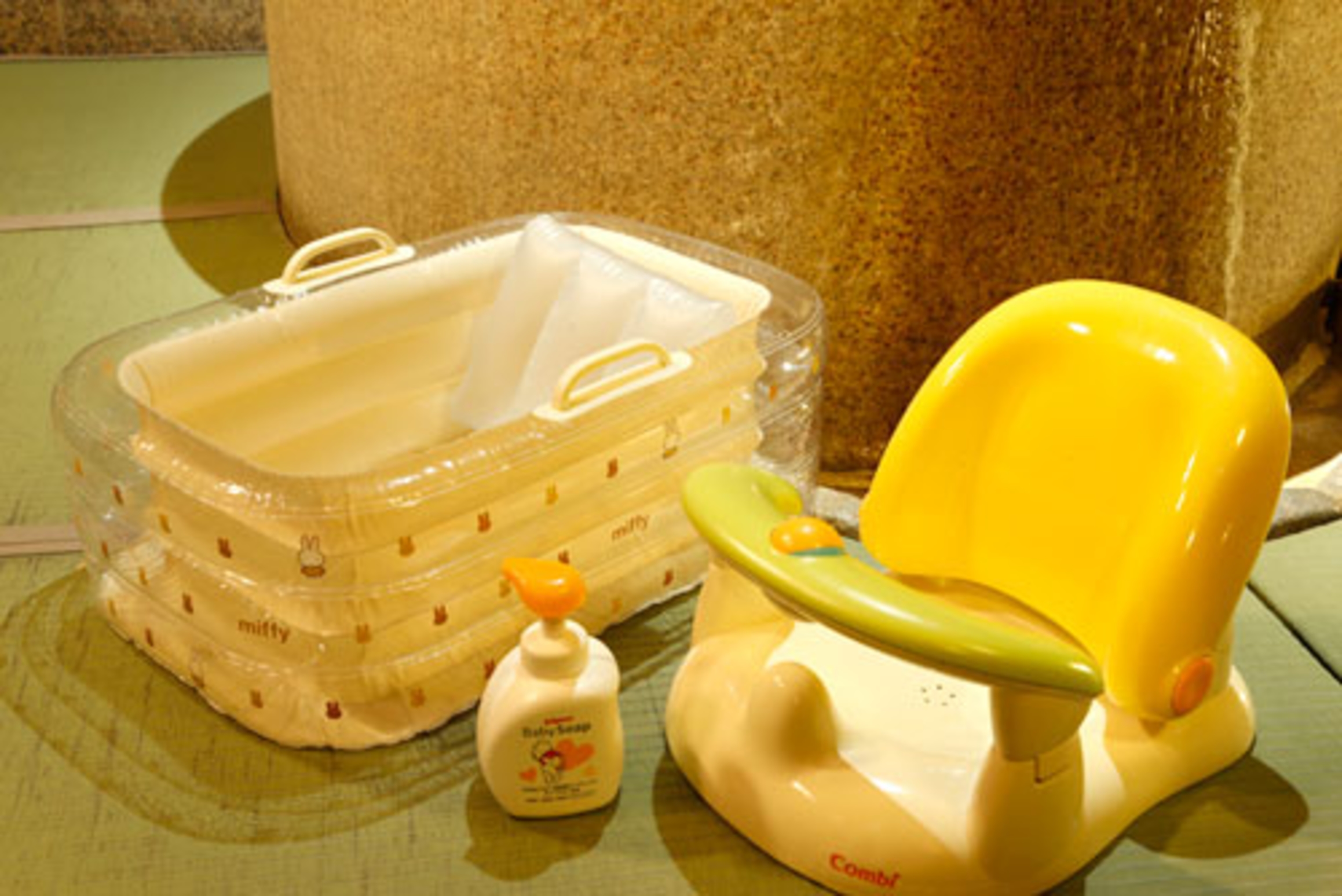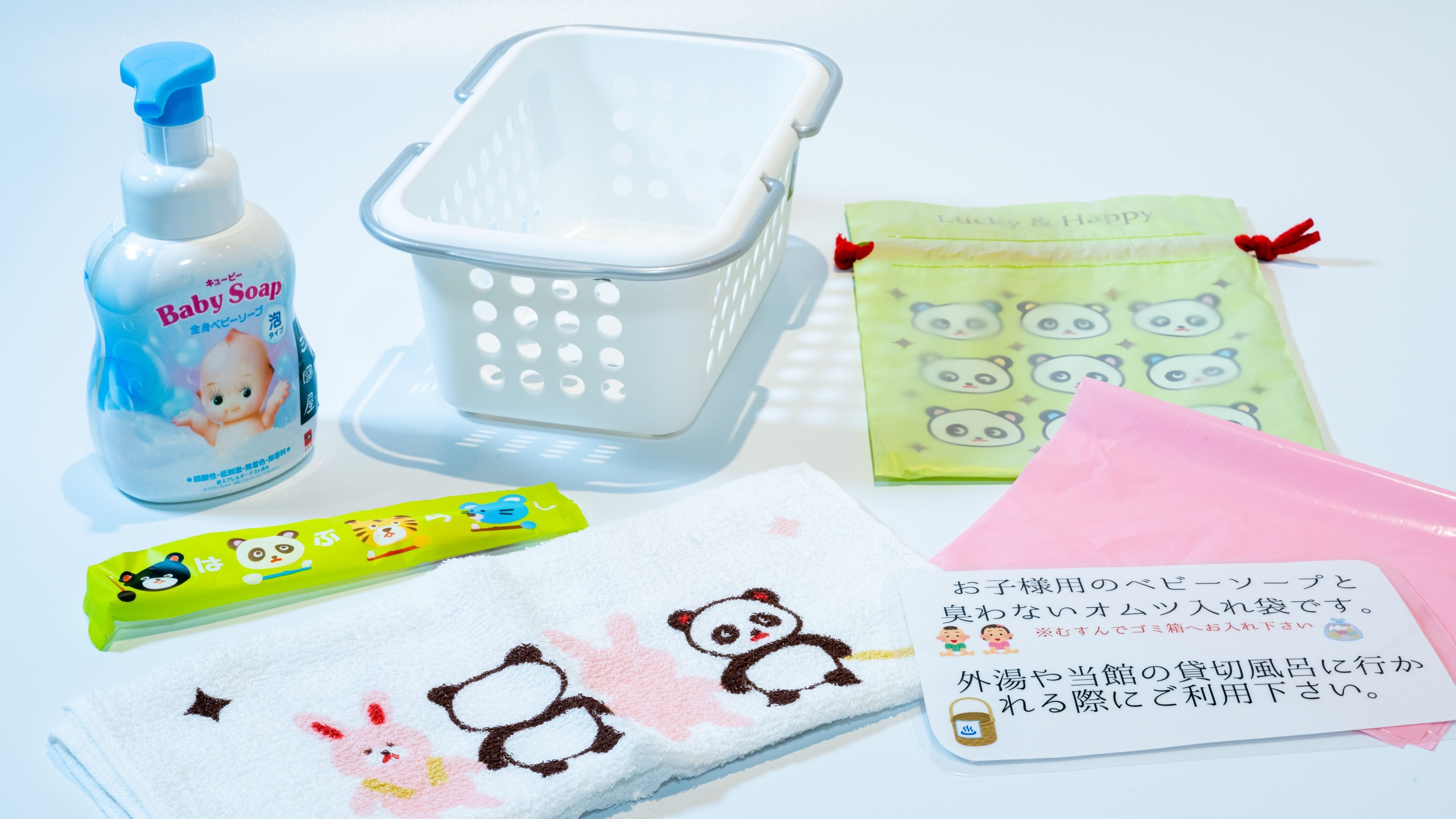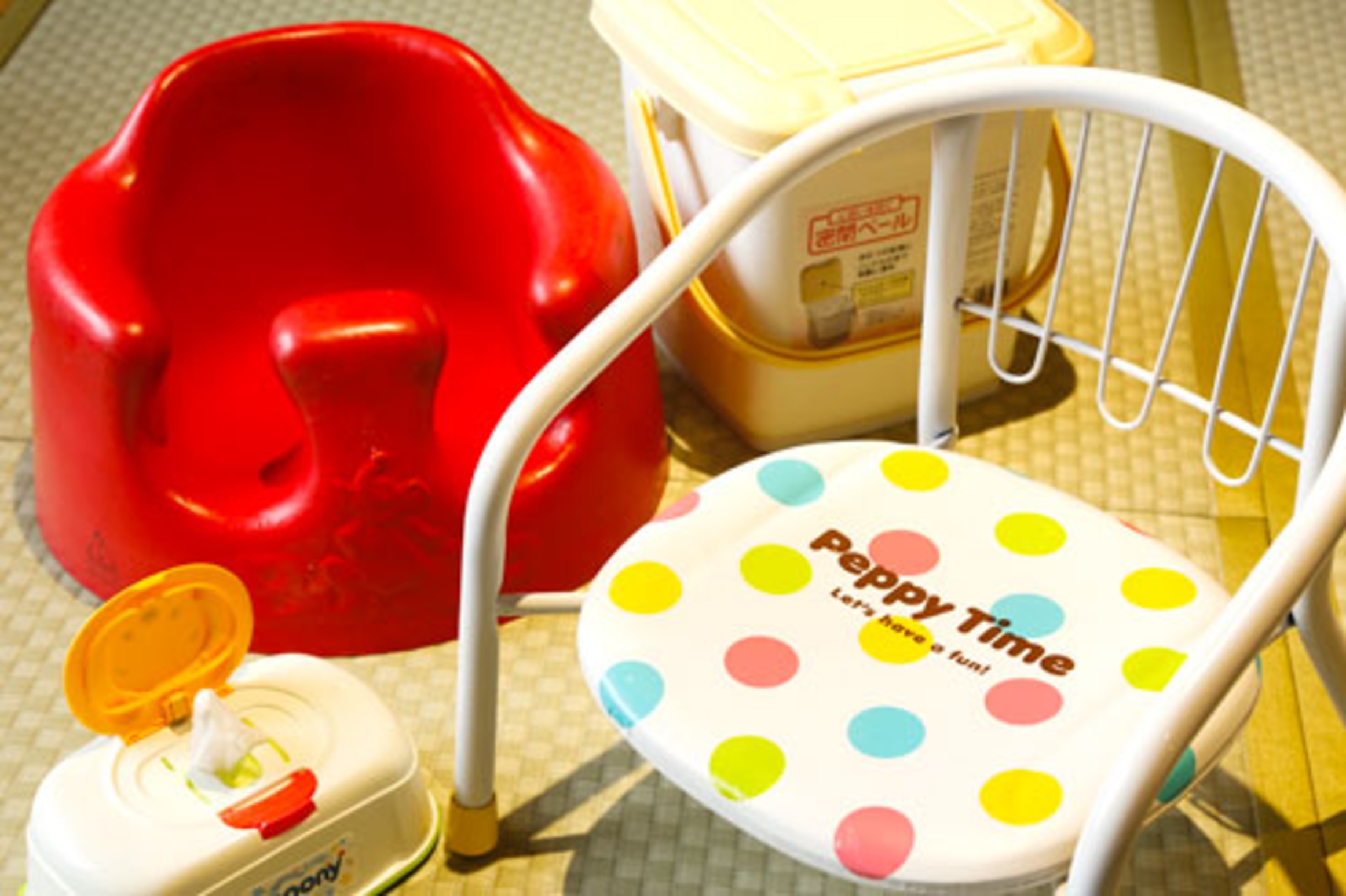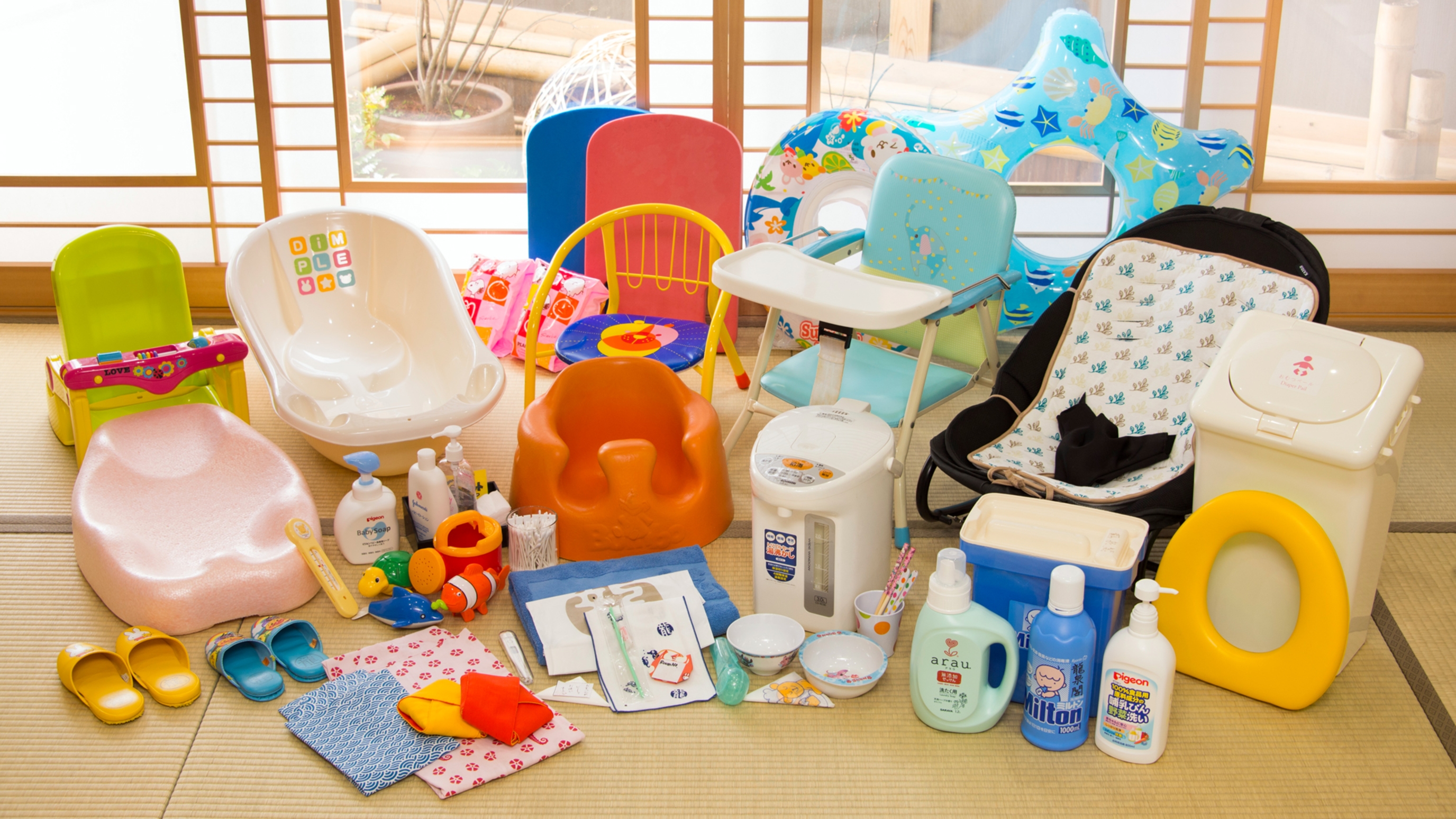 お部屋には赤ちゃん用全身泡ソープ、紙おむつ専用ゴミ箱、おしりふきシート、温度設定つき電動ポット、空気清浄機、補助便座、洗面台用踏み台、バンボチェア、おもちゃ、絵本、プレイマット、バスチェア、お昼寝用布団をご用意。