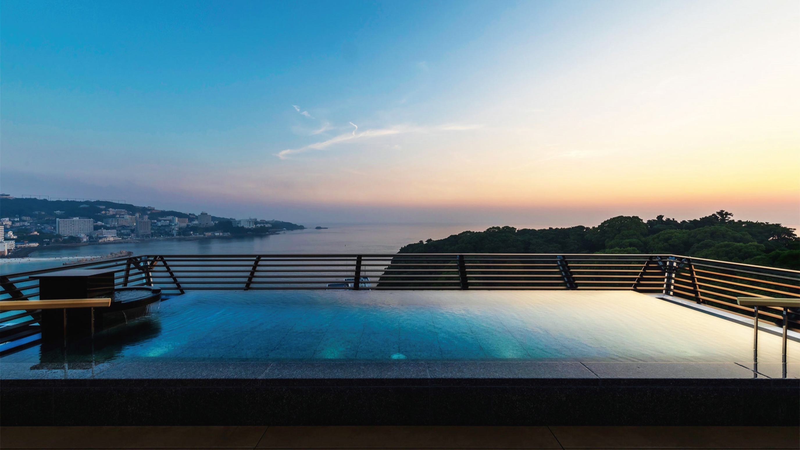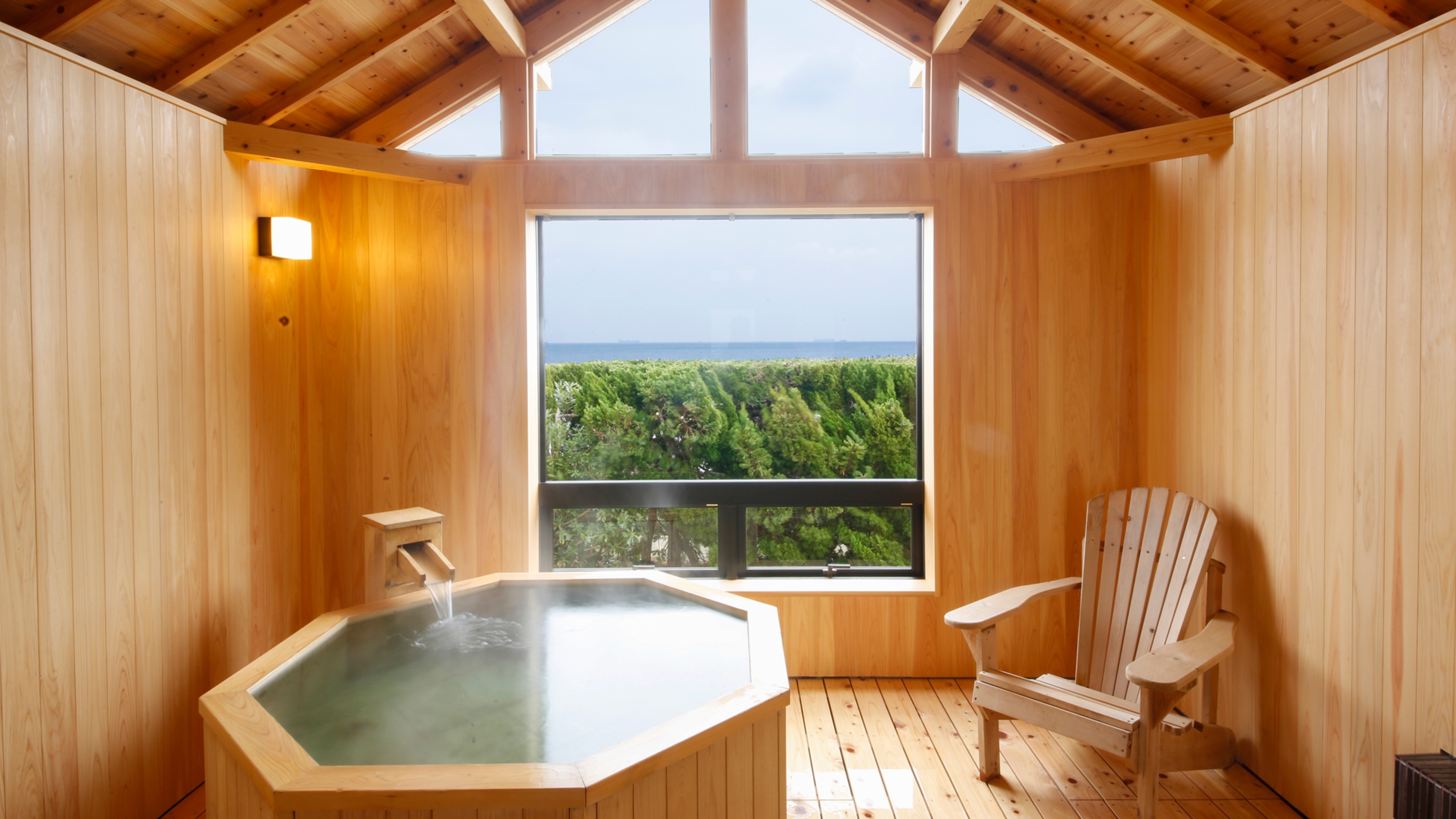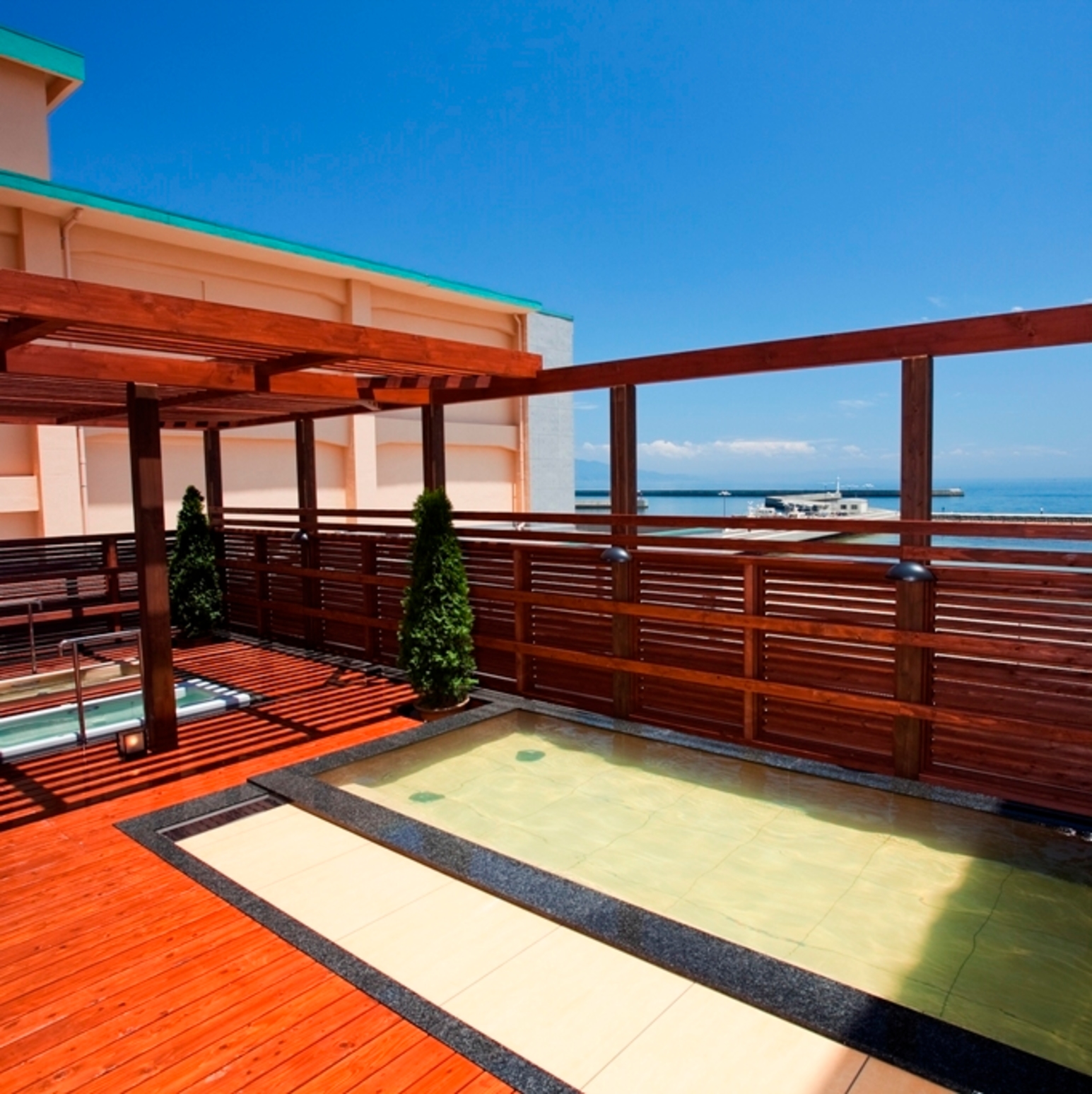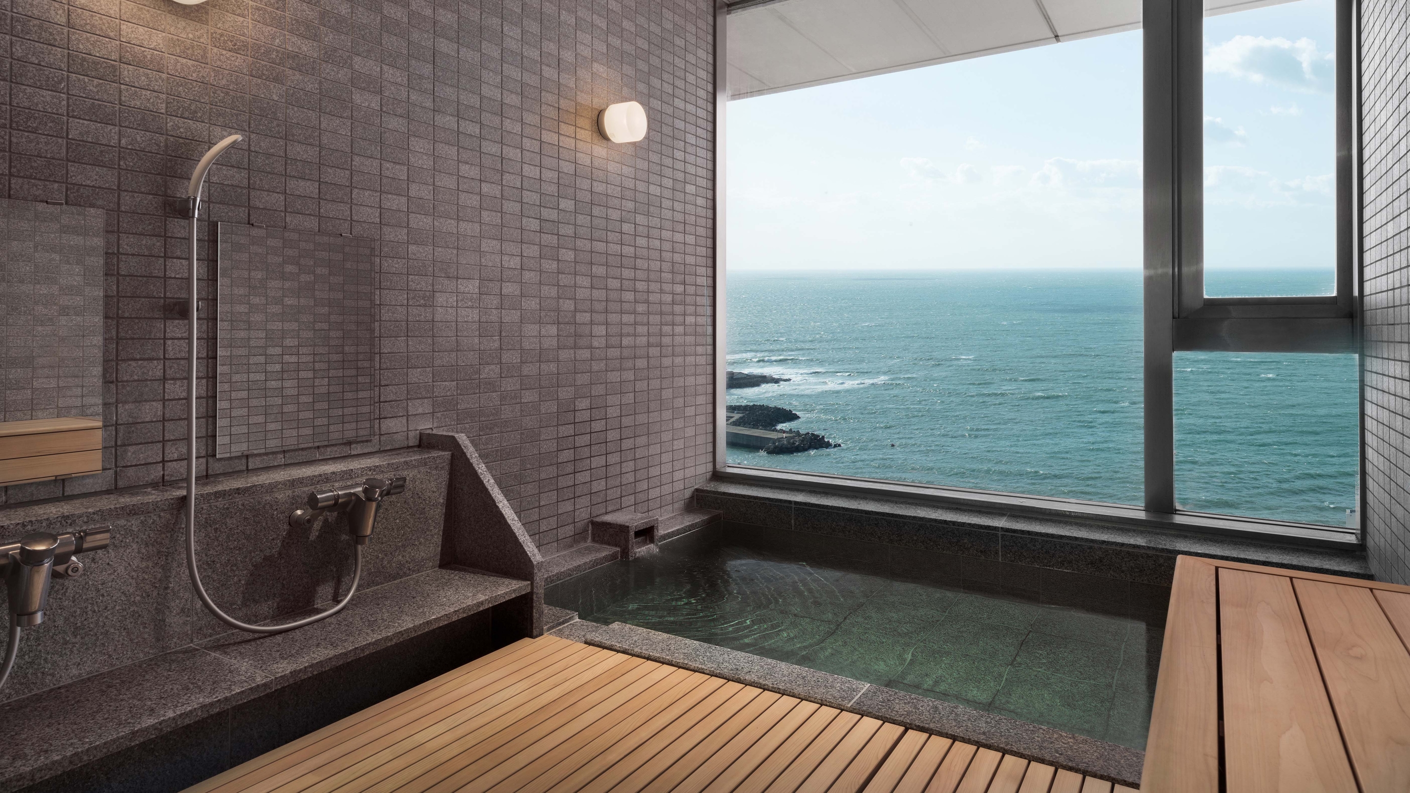 ホテル最上階の温泉大浴場の露天風呂からは、太平洋の絶景を眺めながら入浴でき、ご家族連れのお客さまにおすすめの貸切温泉も完備しています。
