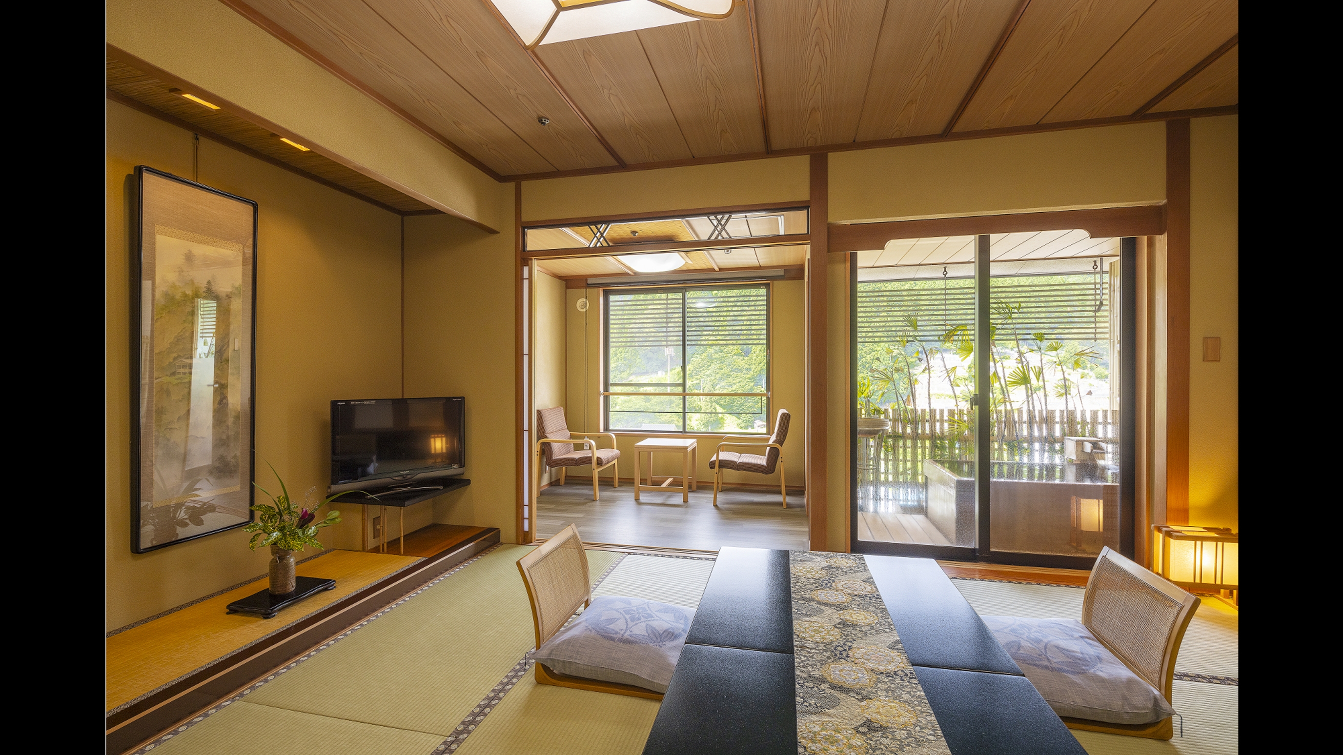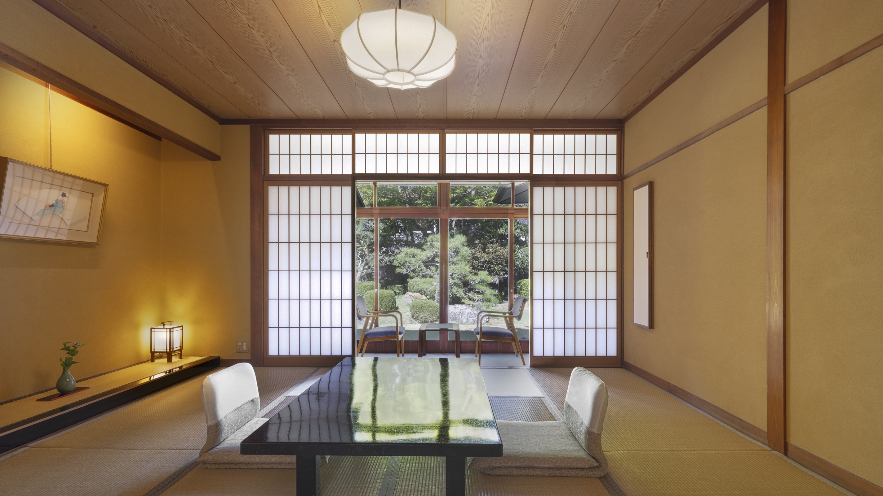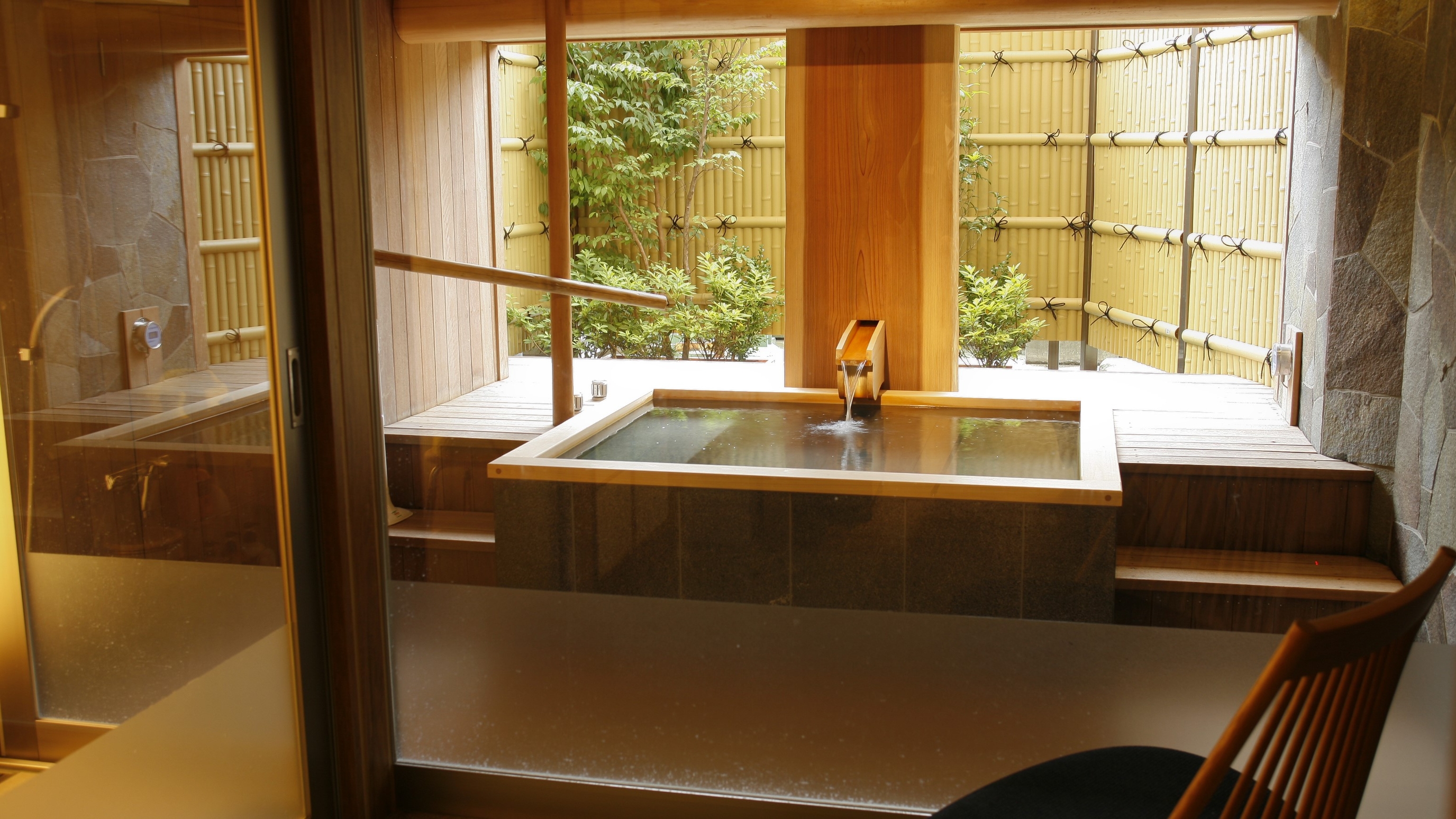 中庭に面した一般客室の他、ゆっくりお好きな時に湯汲みを愉しめる露天風呂付き客室を備えます。