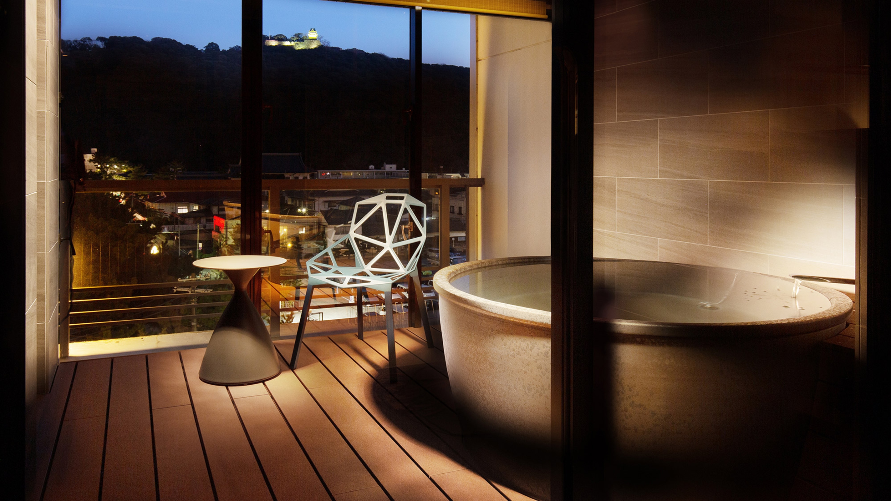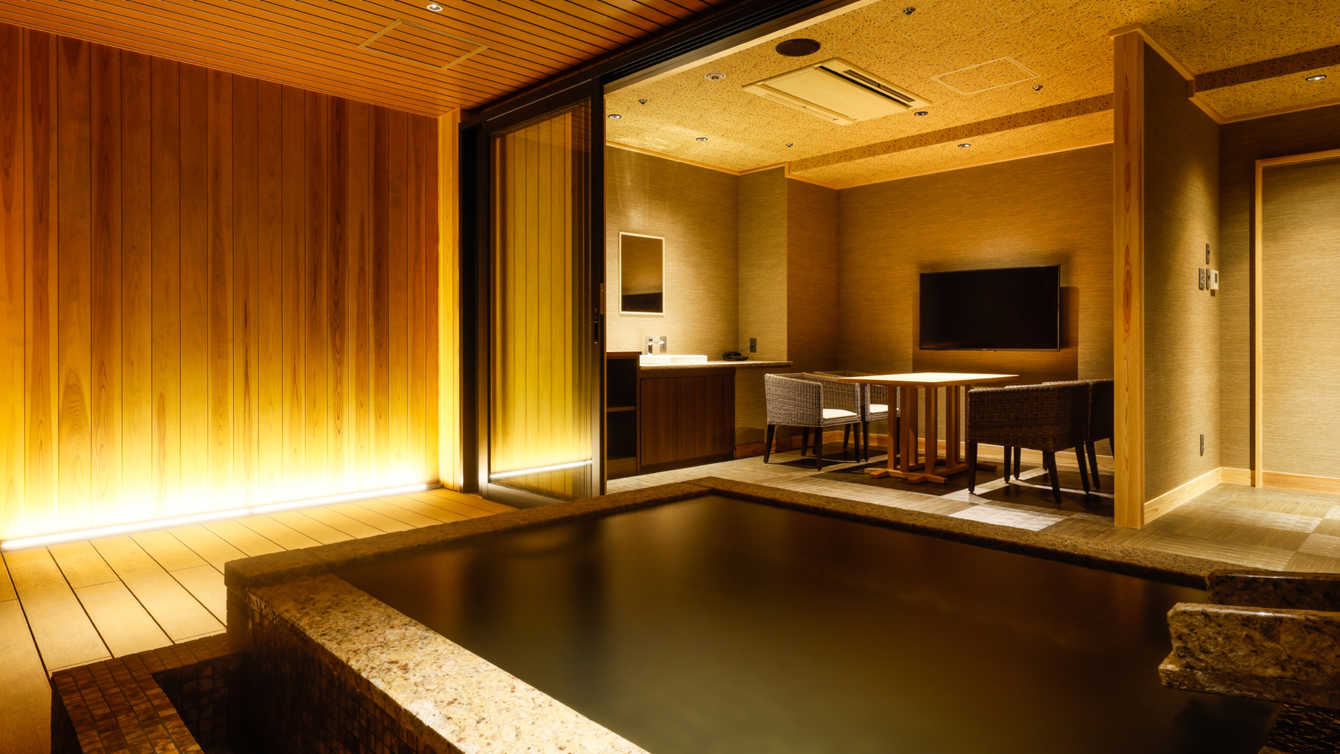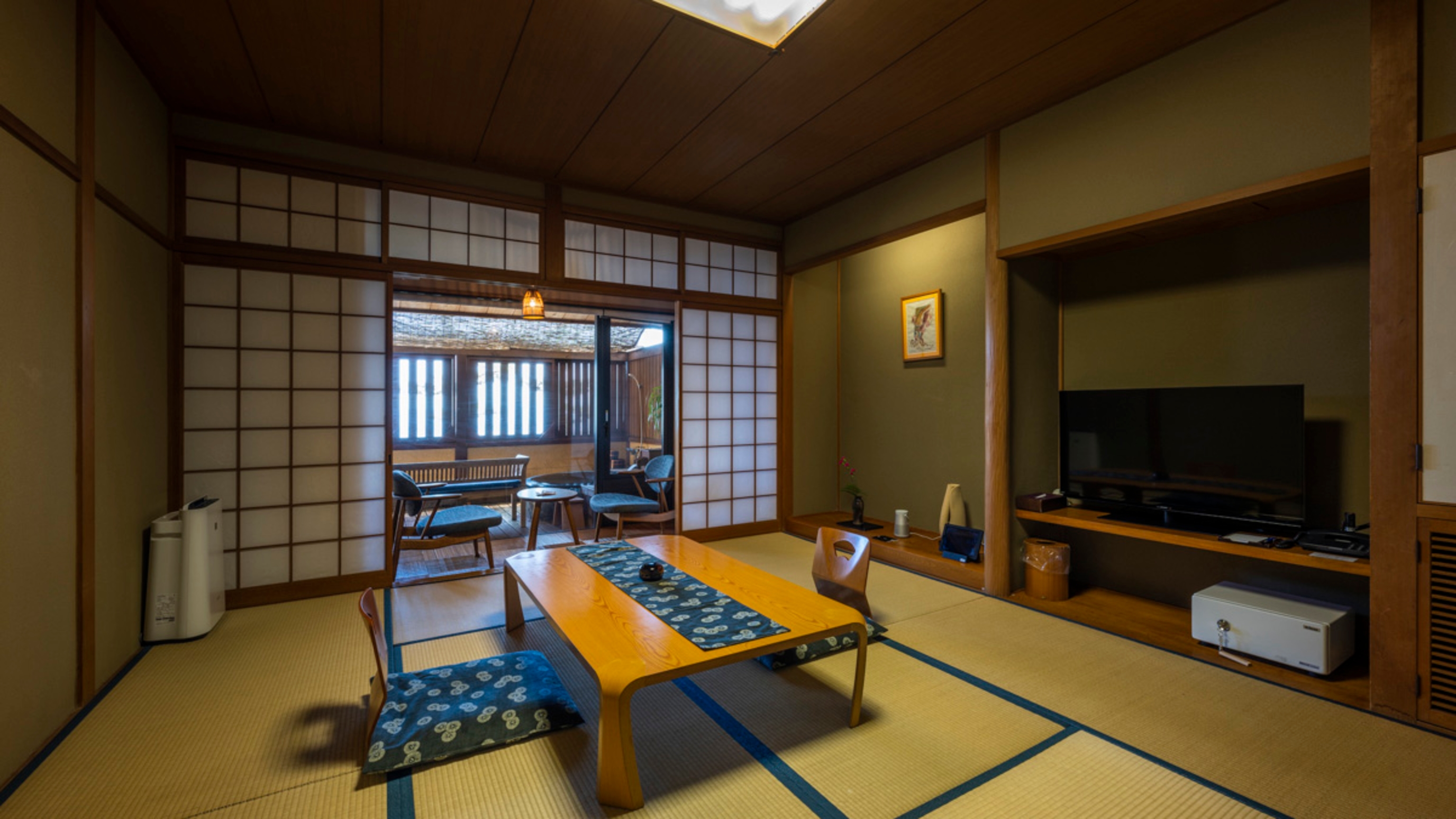 中庭に面した一般客室の他、ゆっくりお好きな時に湯汲みを愉しめる露天風呂付き客室を備えます。