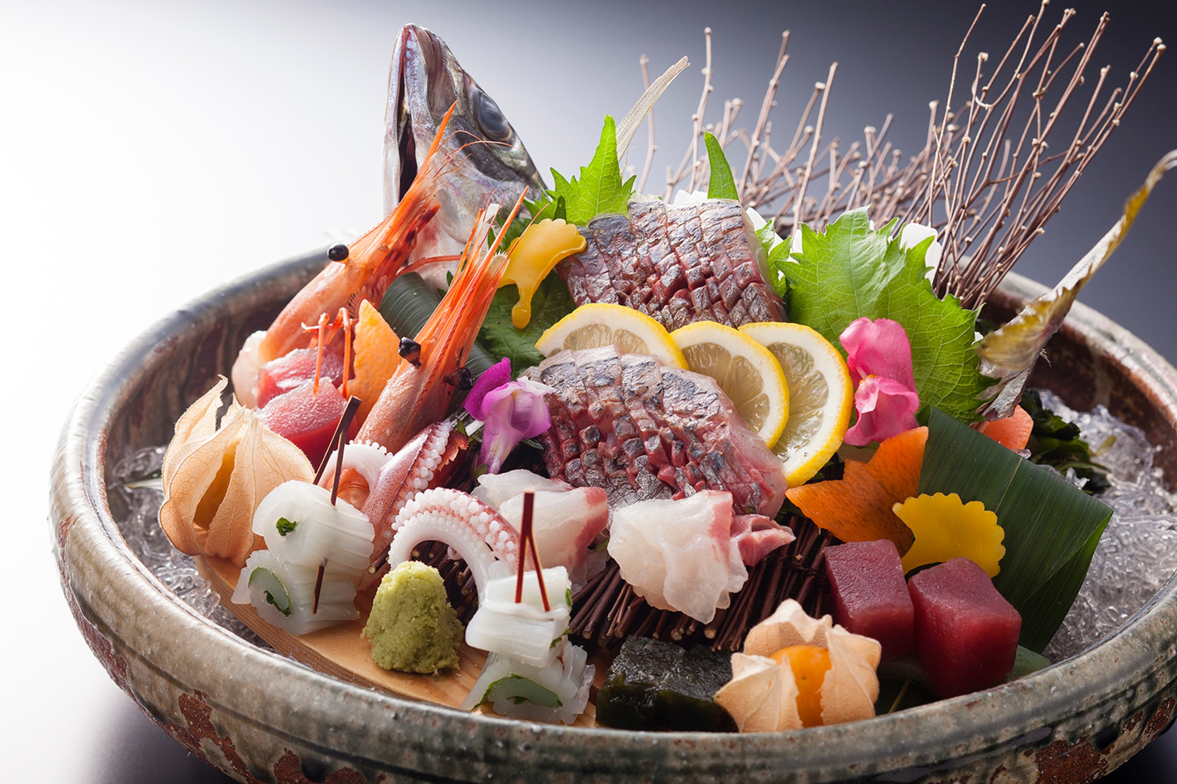地物にこだわった、日本海の旬魚を竹野町花房のたまり醤油で頂くお造りに、但馬牛や但馬鴨などその時々の食材を使用した小鍋など