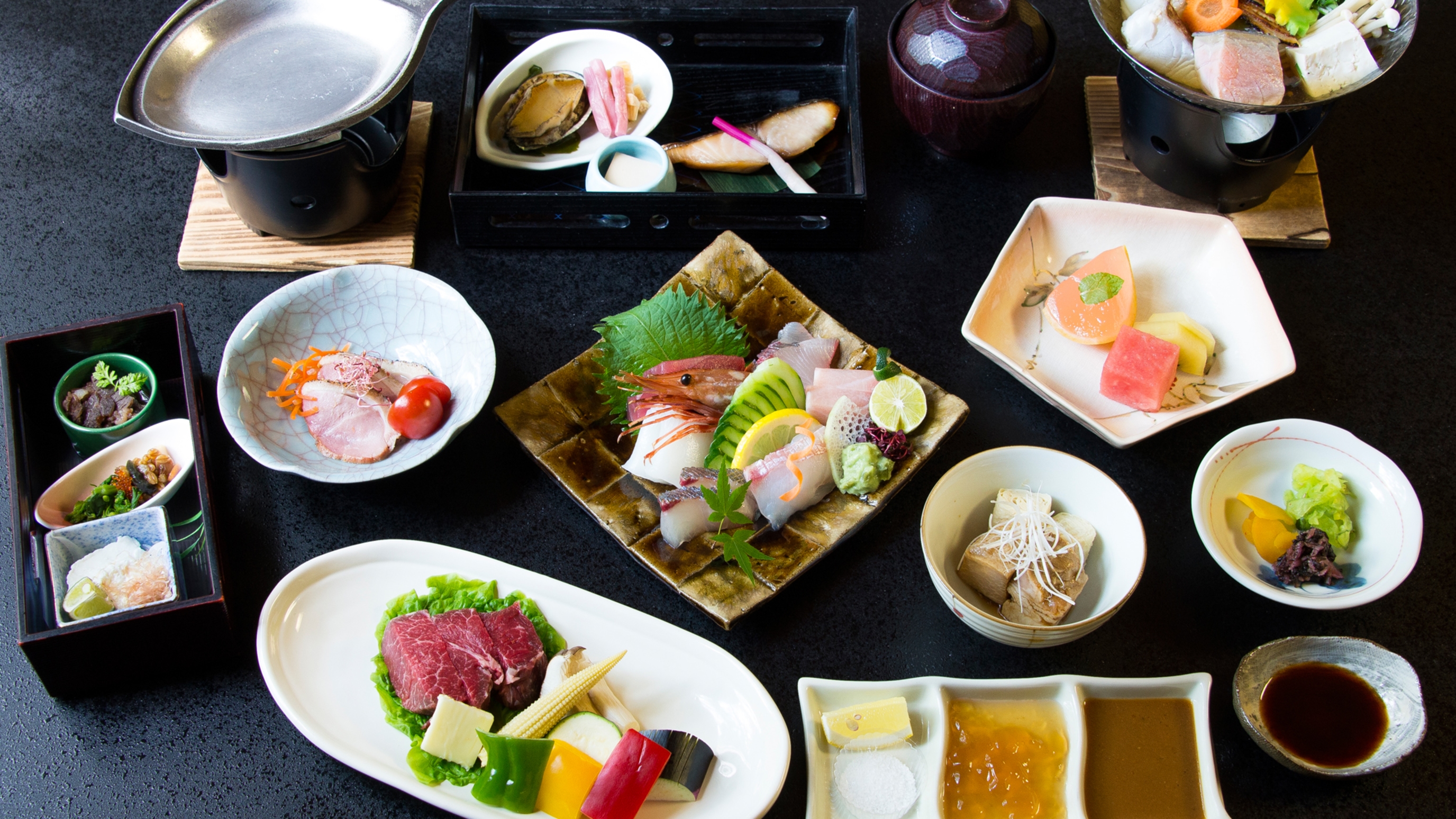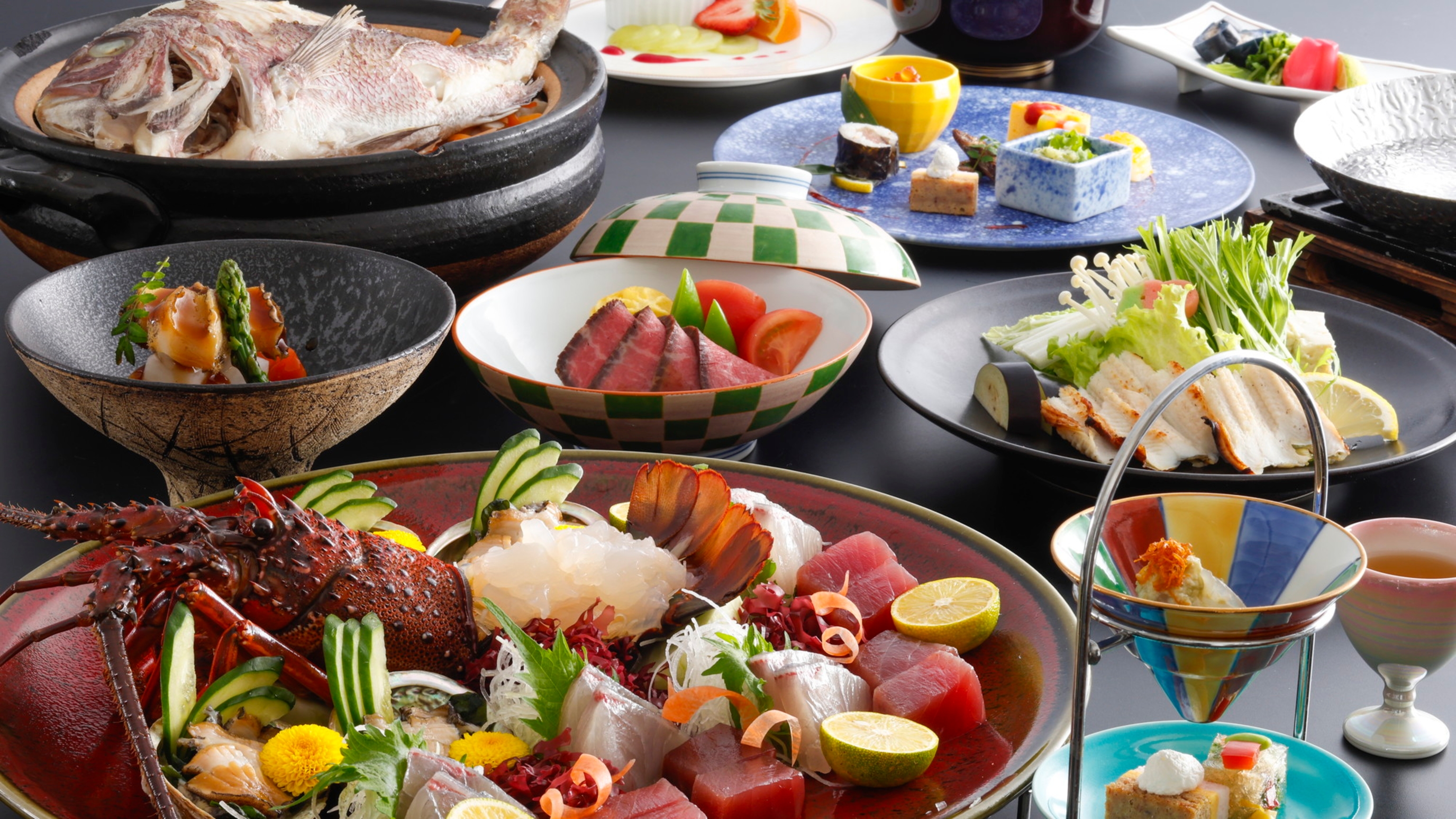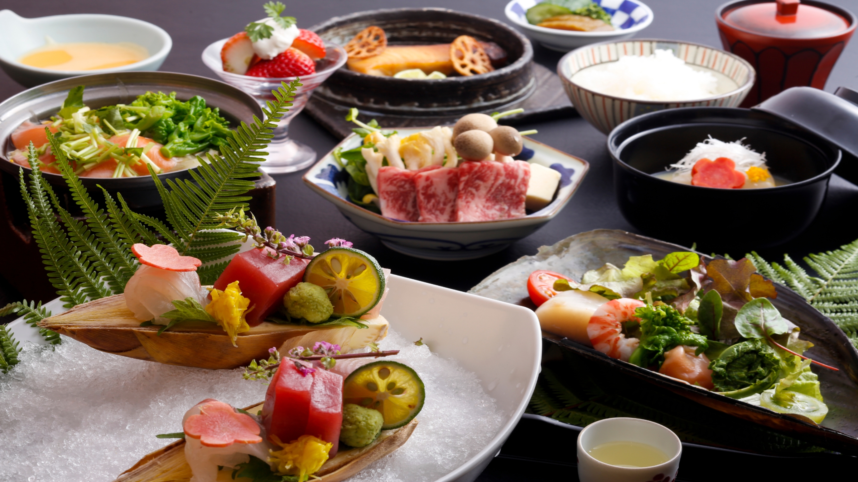 白浜の豊かな海が育んだ魚介をはじめ、熊野牛、紀州うめぶた、地元の無農薬野菜、紀州梅、特産の果物など、季節ごとの旬の幸を活かした朝食・ディナーメニューは季節によりブッフェでのご提供となります。