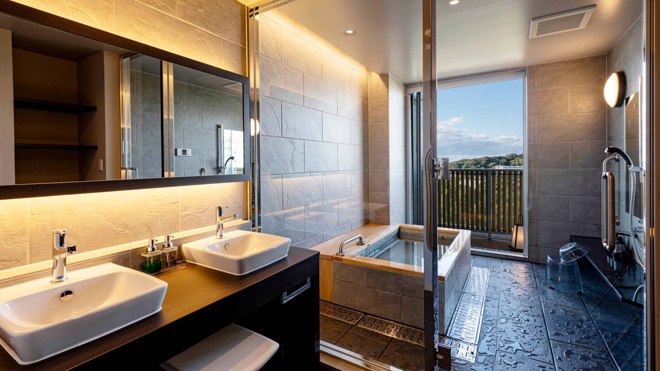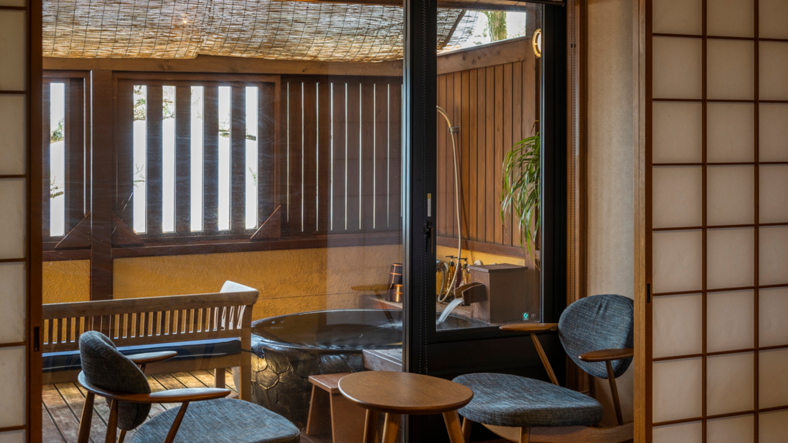 開放的な半露天のお風呂は、木の温もり感じる浴室に仕上がっていて、お風呂チェアやベビークーハンも用意していますので、赤ちゃん連れのファミリーにも快適に過ごせる設計になっています。