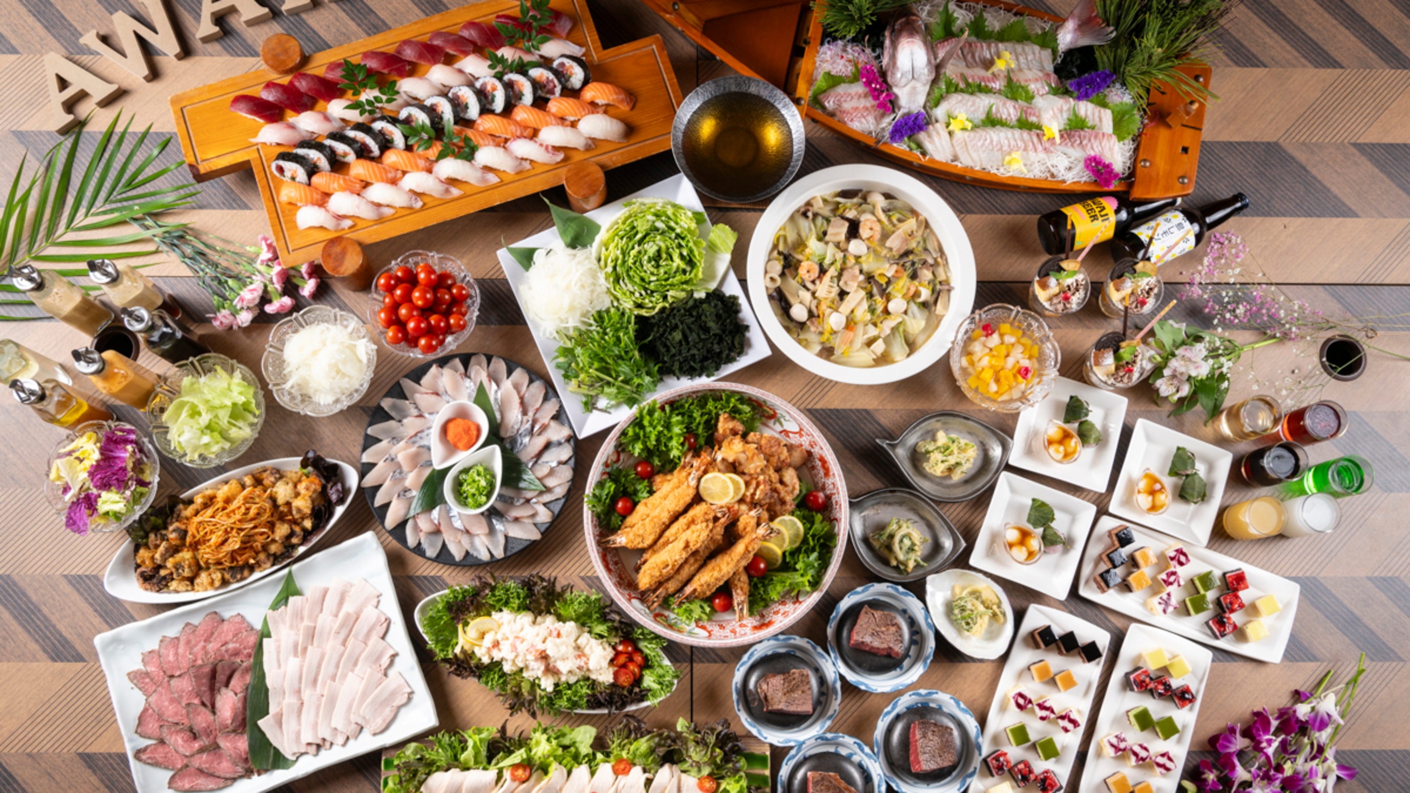 紀州の新鮮な海の幸を中心とした会席料理の他、和・洋・中、多彩な料理が揃うバイキング形式。