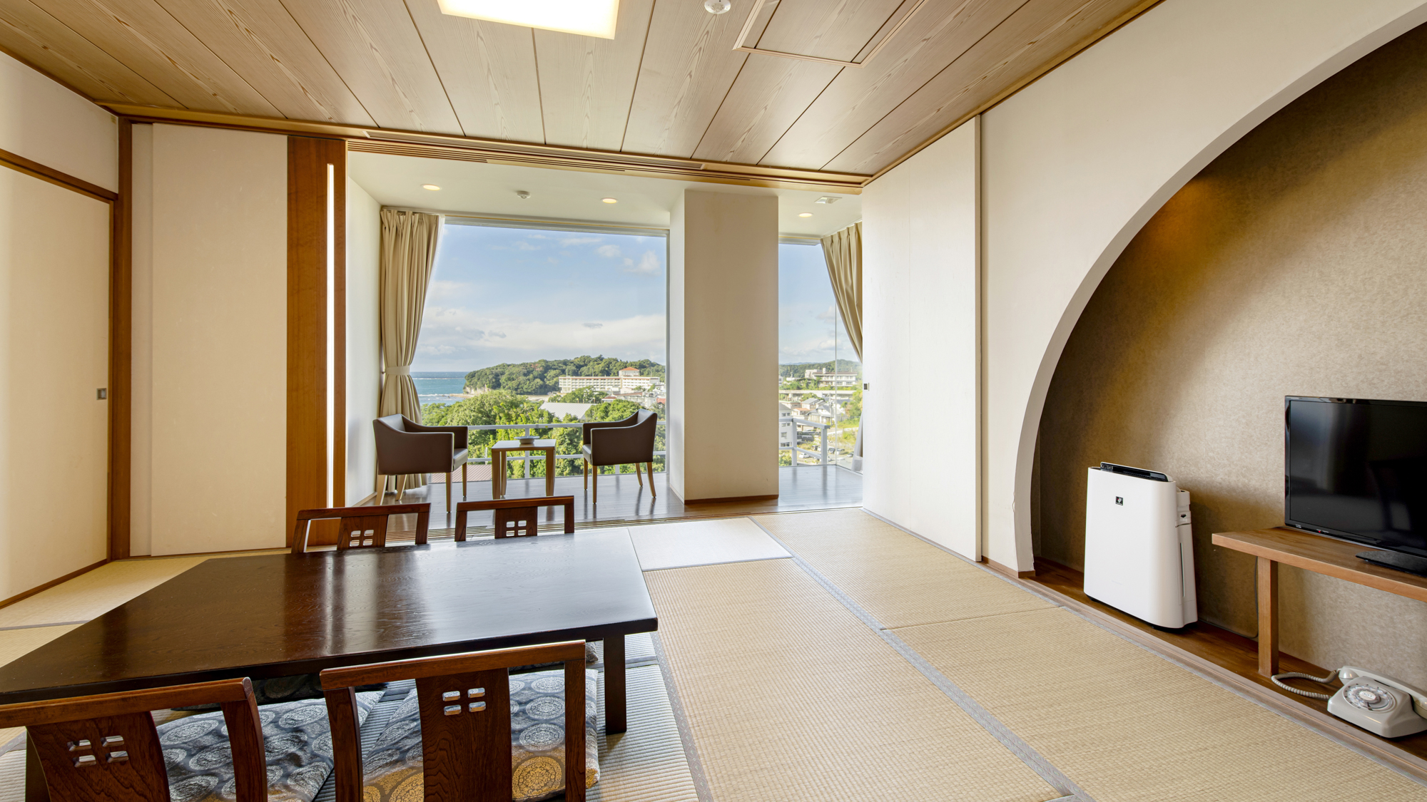 オーシャンビューの客室、温泉付きの客室、和の趣を生かした客室など、豊富な客室を備えます。