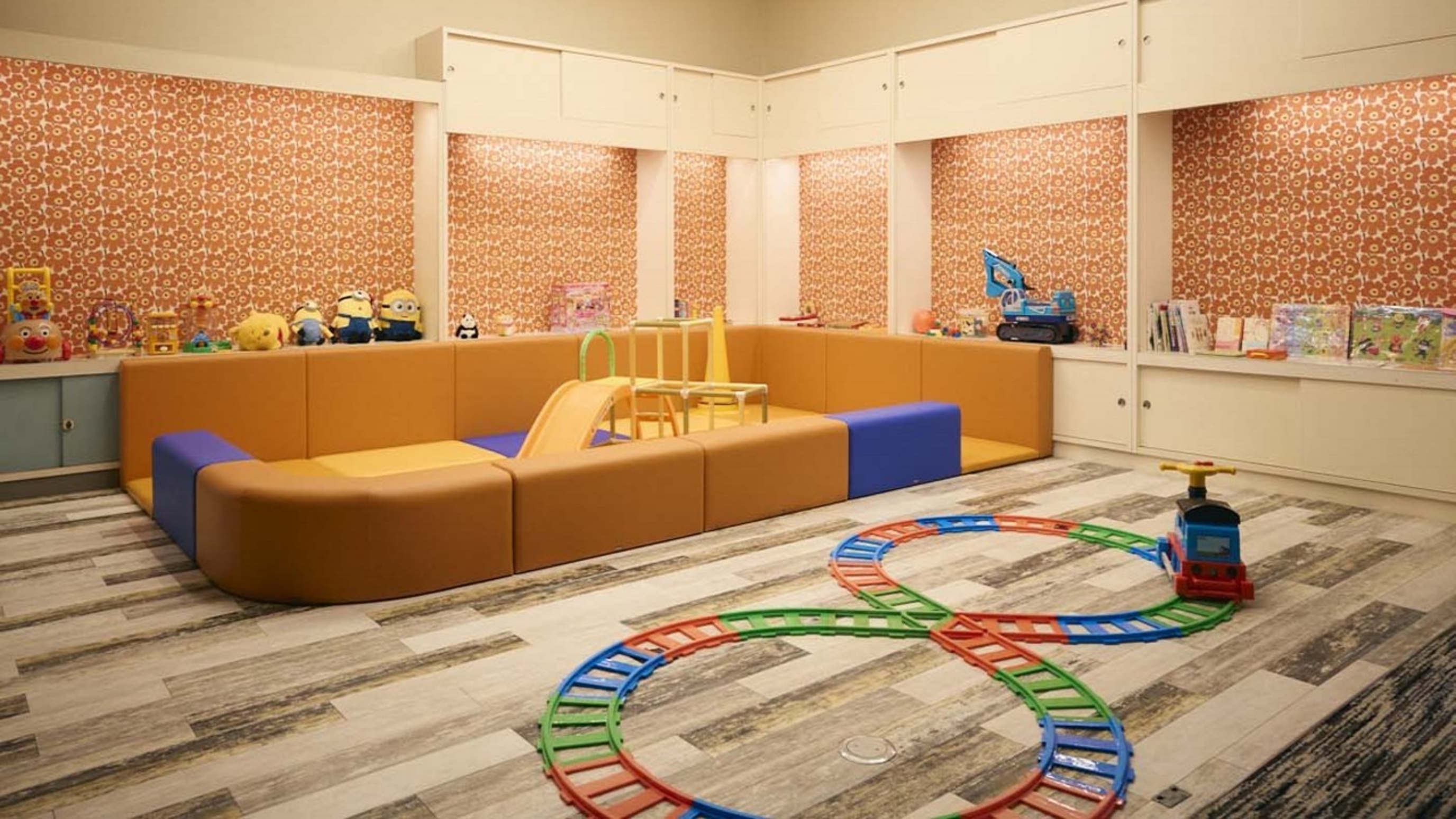 1階ロビーフロアには靴を脱いで過ごせるキッズスペースあり、滑り台や輪投げ、動く電車、絵本など、チェックイン時や悪天候時でもお子さまが楽しむことができます🎵