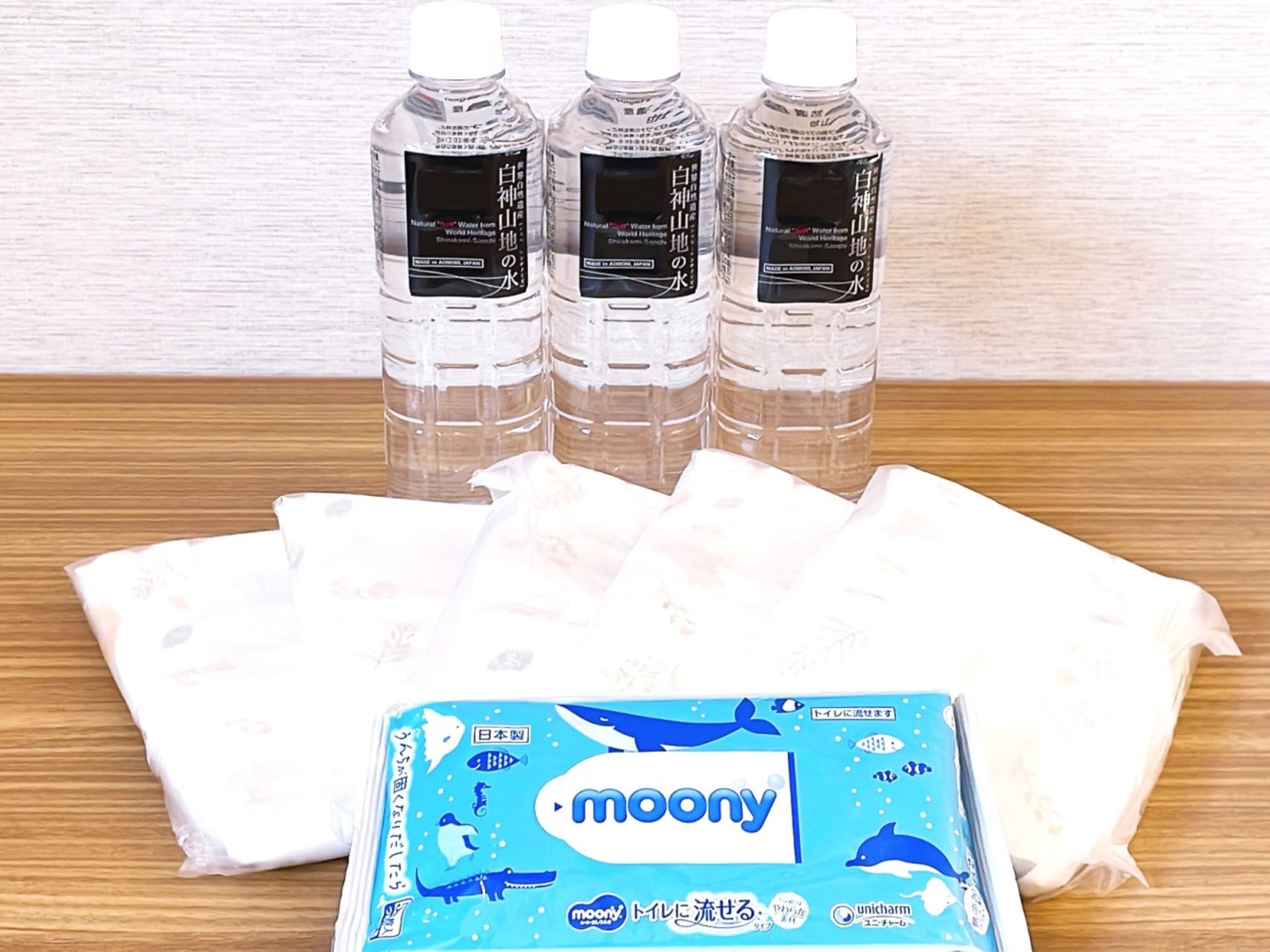 - 紙おむつ 5枚(S、M、L)・おしりふき1個プレゼント