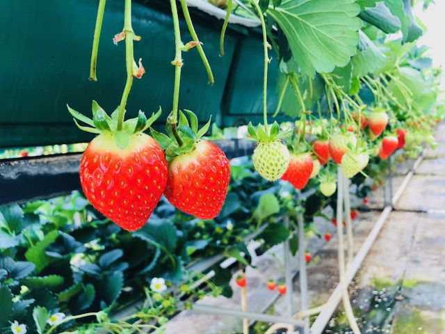 ハウス内は立体構造のベンチ栽培なので、立ったままでイチゴ狩りが楽しめ、バリアフリーなので、子供からお年寄りまで、安心してお楽しみいただけます!